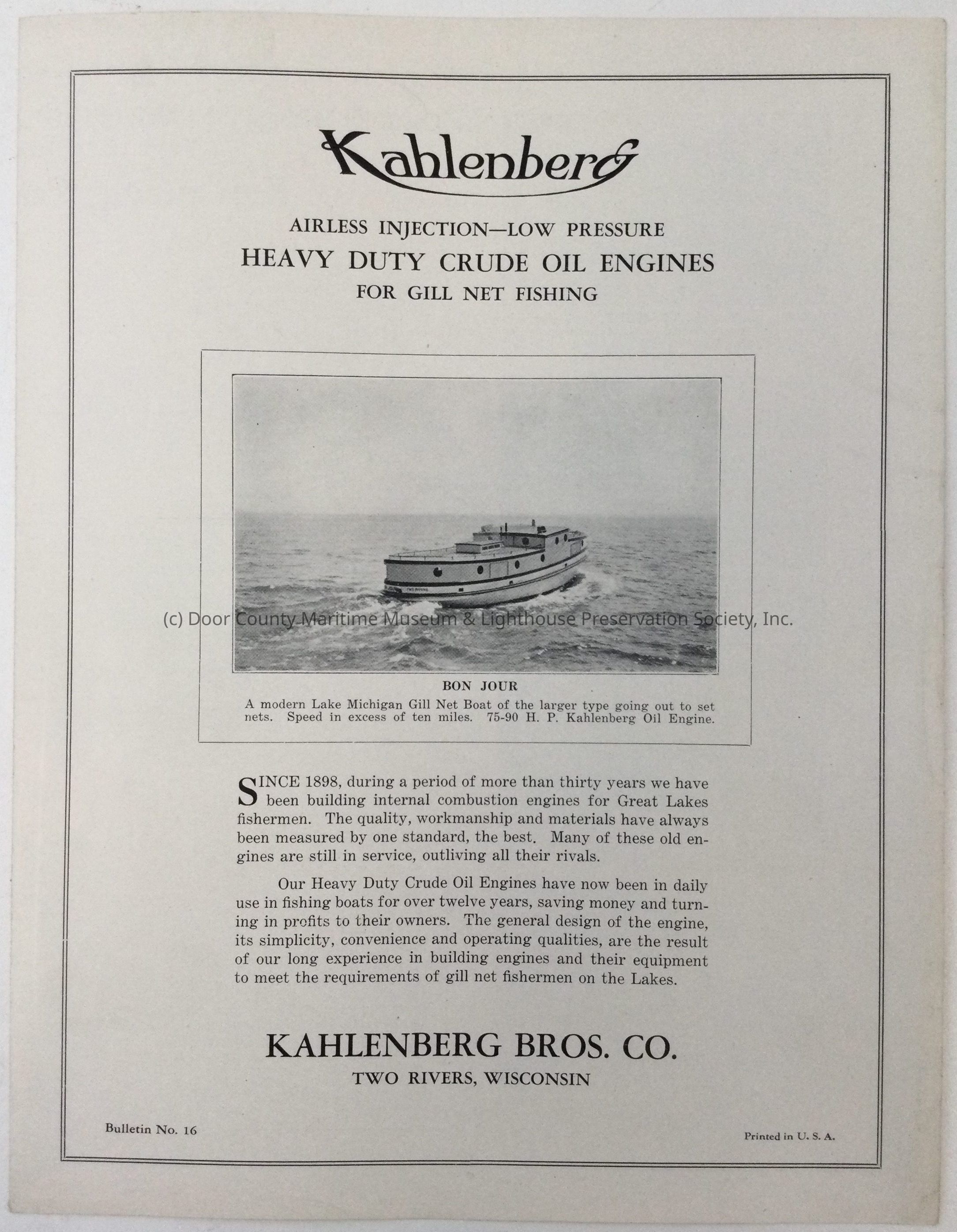 White cover with black print. contains photogrpahs of Kahlenberg crude oil engines and some fish tugs that use them. One sheet folded in half. "Bulletin No. 16".Location
