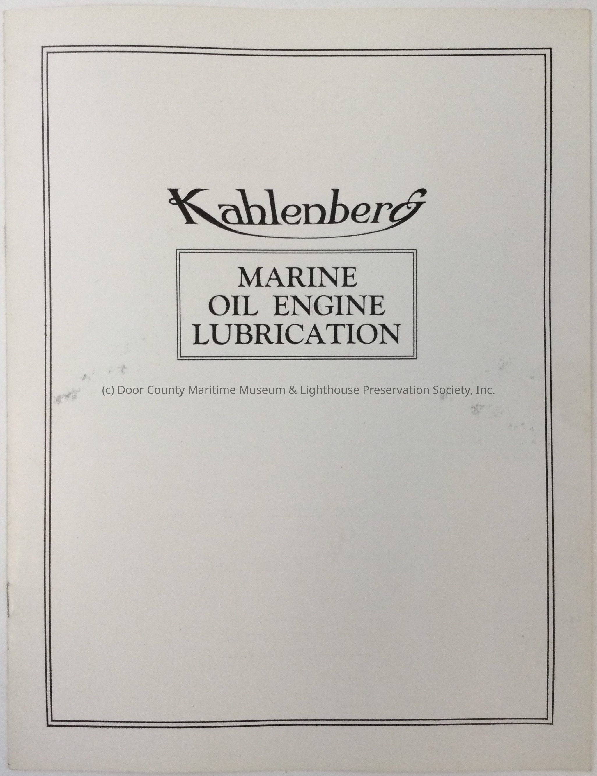 White cover with black print. "Kahlenberg Marine Oil Engine Lubrication". Contains photogrpahs of Marine oil engines and describes the lubrication system.Location