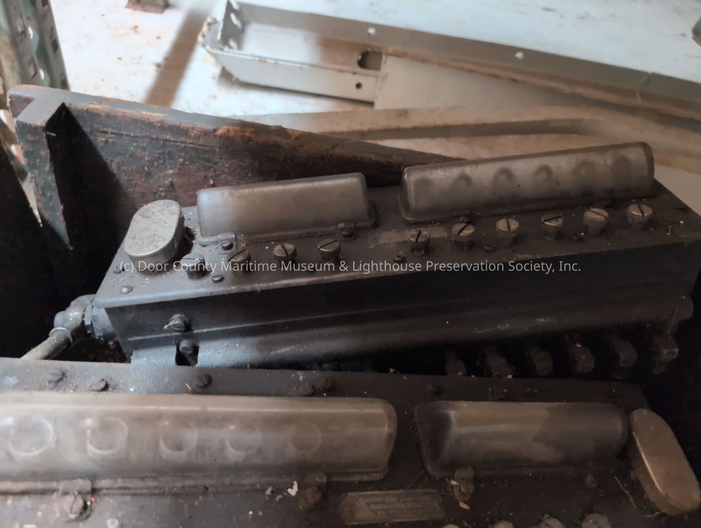 Black colored metal. Covered in grime and grease. Label riveted on top. Glass protective covers over injectors. Rotating handle on one end. Bar on opposite end.