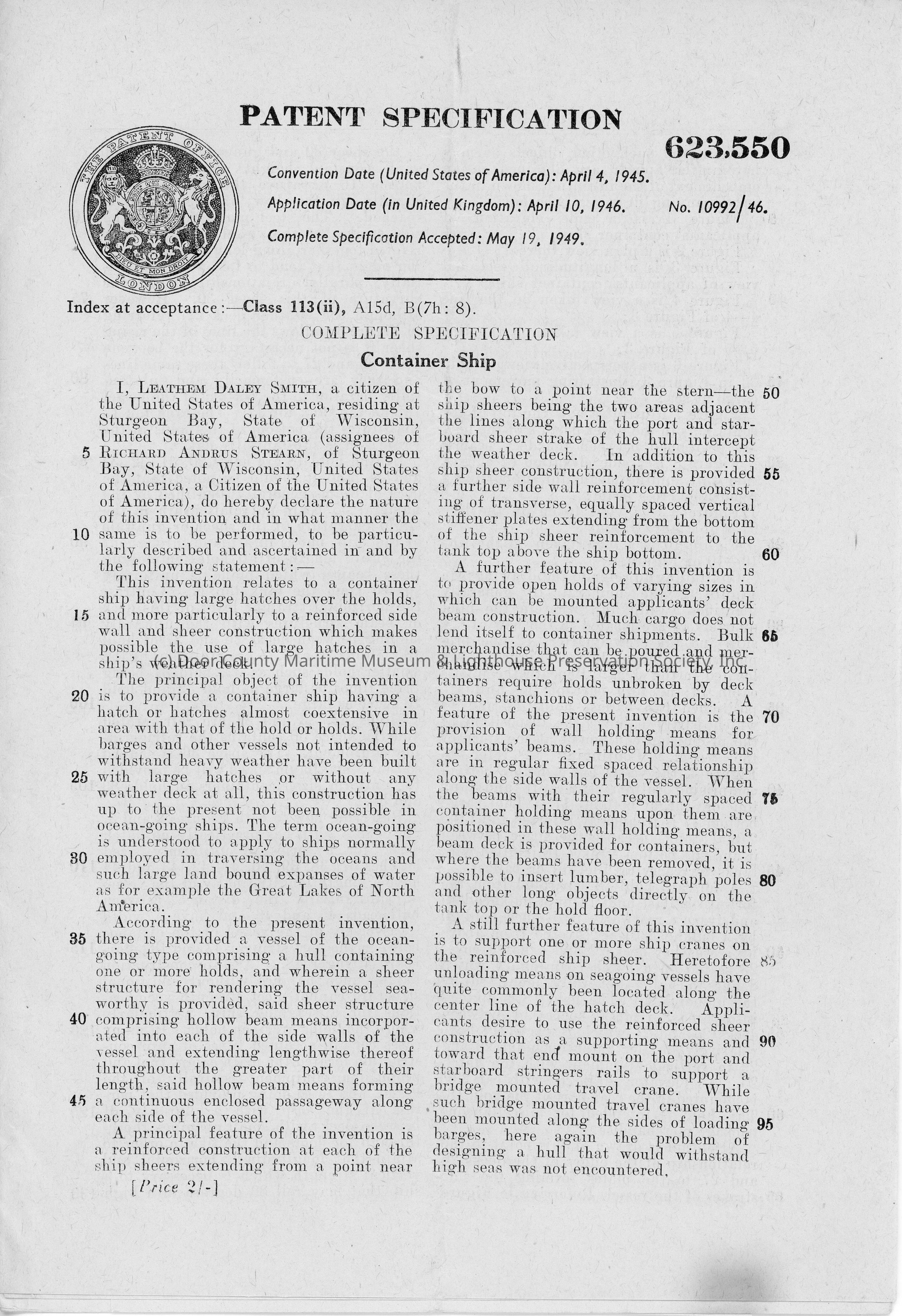 L.D. Smith Container ship Patent specification
