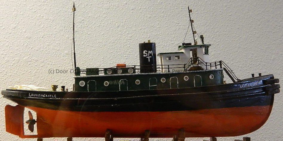 Lauren Castle on stern (side) and bow; tugboat; red, black green and white and gray; black smokestack with SMT in white
