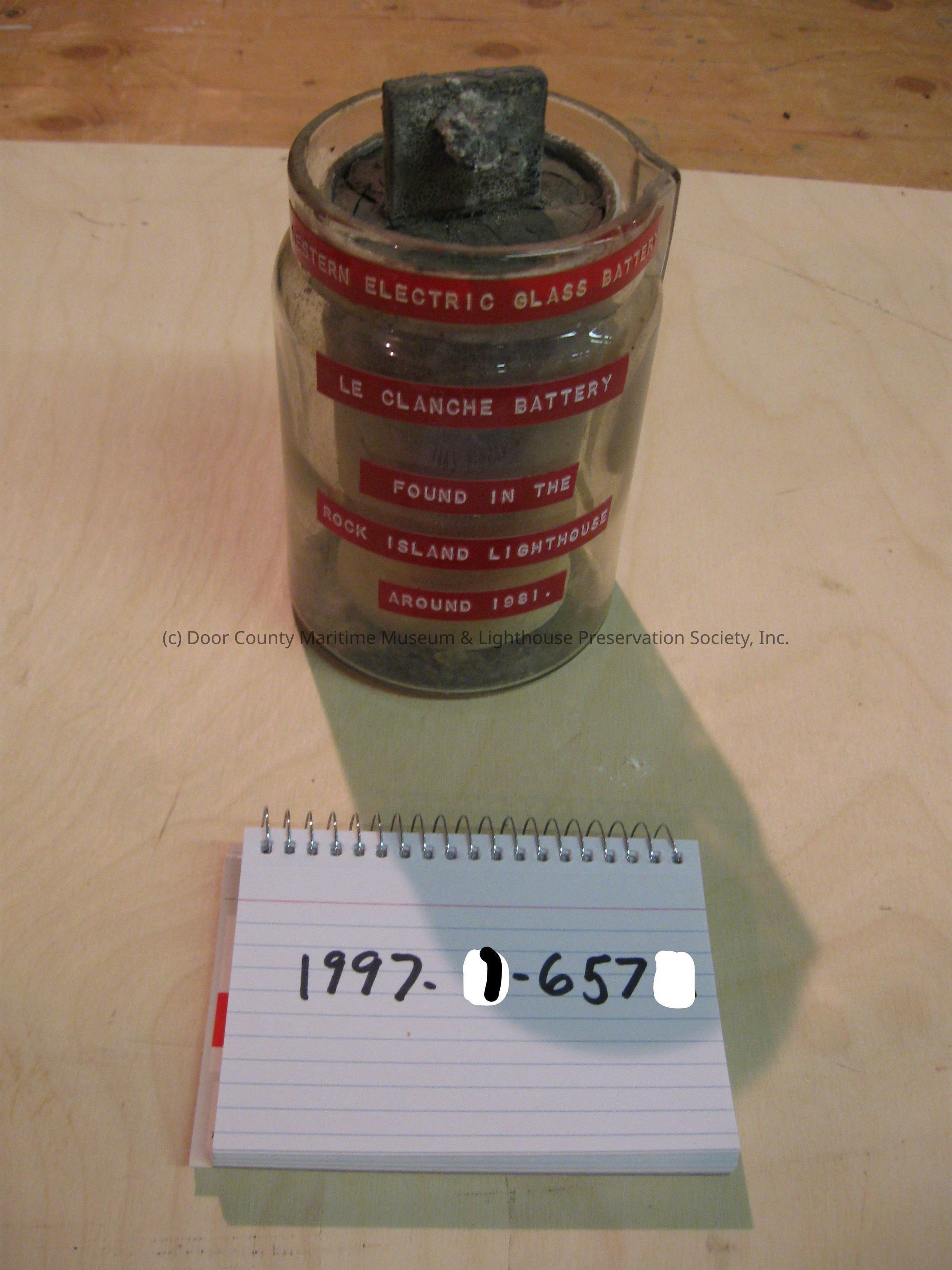Western Electric glass battery. Directions on glass, uses salammonice, water glass container is shaped with a pour spout at one end of the band at the top: Inside is a white pours container with a black top & plate with a wing nut at the top.