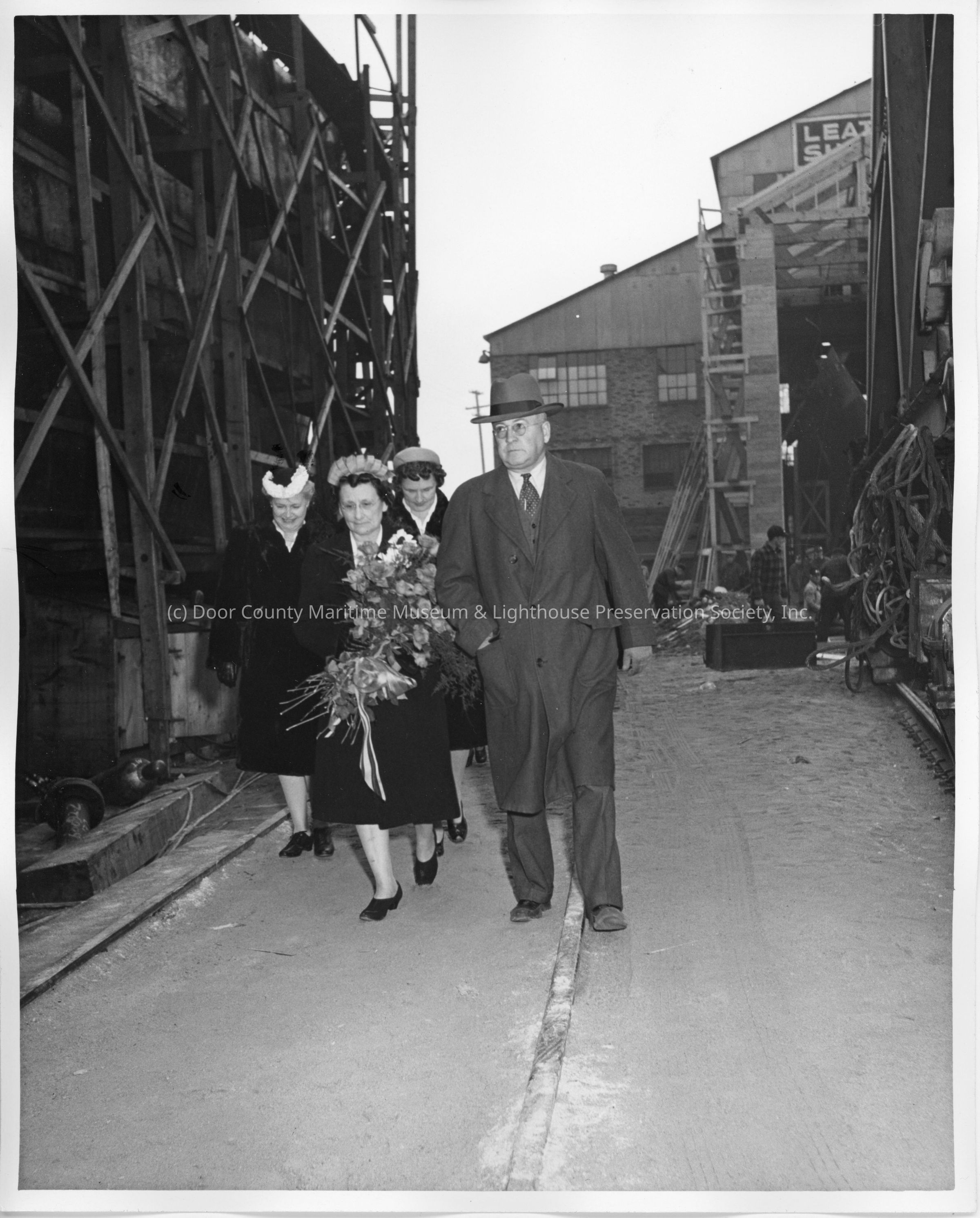 Leathem D. Smith and ship sponsor walking through Smith yardEntry/Object ID