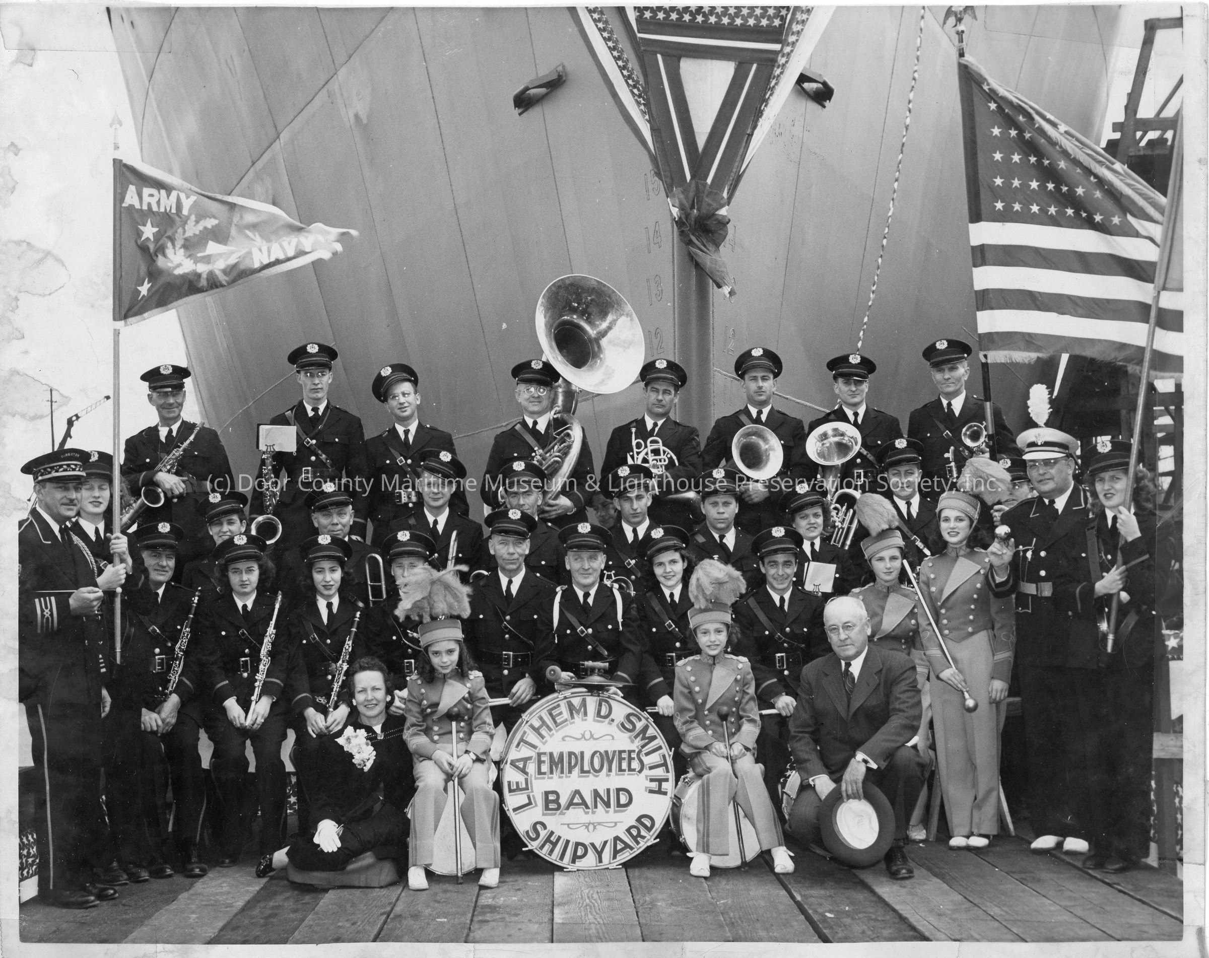 Leathem D. Smith Band posing in front of YW-128 May 22, 1945
