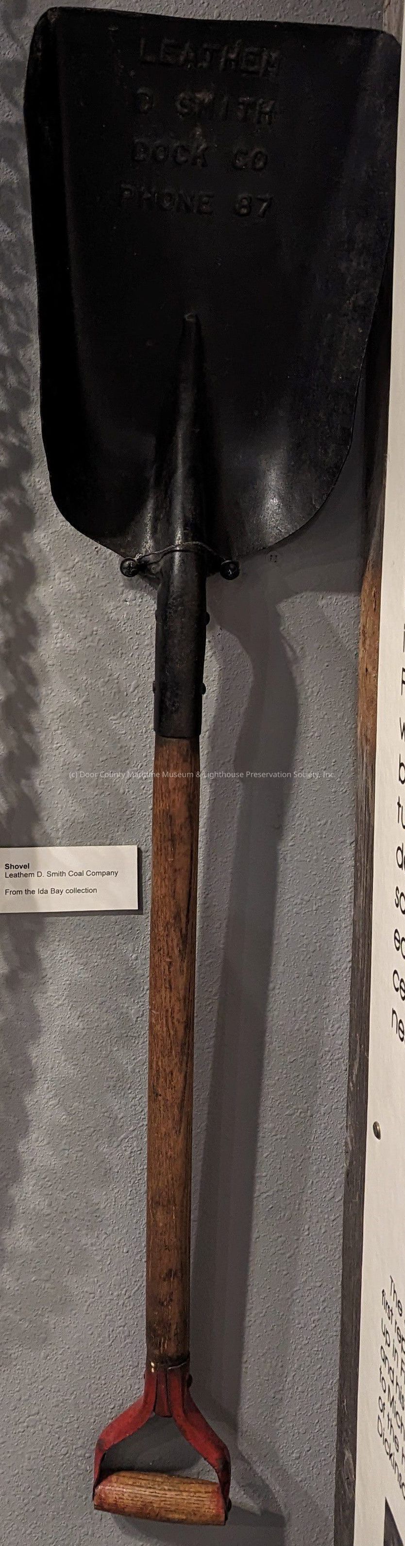 Leathem D. Smith Dock Co. shovel. "Phone 87". Red handle. Shovel blade is black