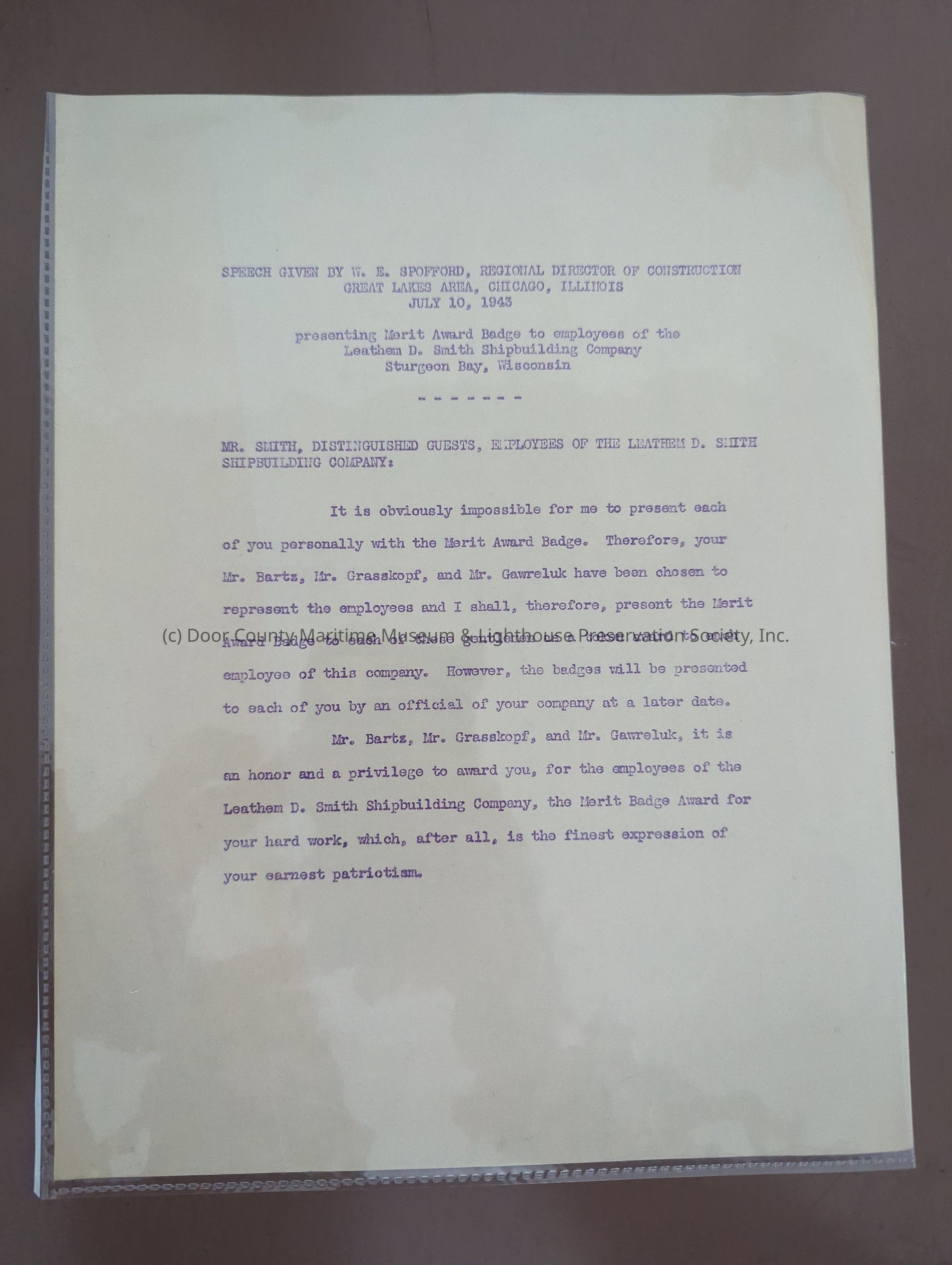 Leathem d. Smith merit award badge speech 1943