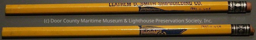 Two pencils: Yellow with blue print; black and silver metal eraser holder; brown worn eraser; Leathem D. Smith Shipbuilding Co., with picture of Army-Navy "E" flag.Location