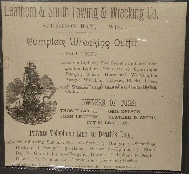 Photograph of newspaper ad for "Leathem Smith Towing & Wrecking Co., Sturgeon Bay, WI--complete wrecking outfit; owners of tugs, private telephone line to Death's Door."Location