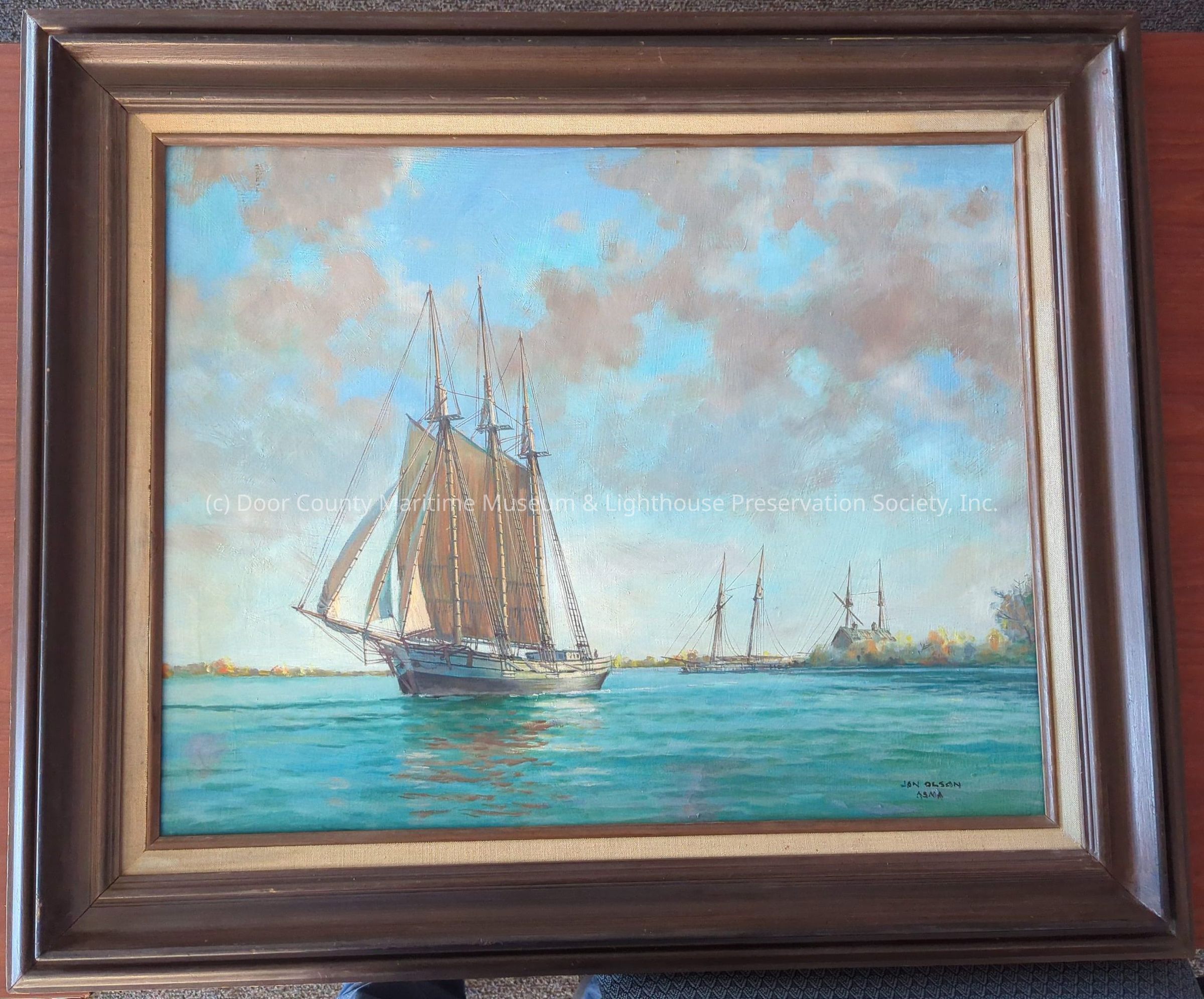 Oil Painting in brown and white frame. Depicts schooner sailing in foreground with two schooners in the backgroundLocation