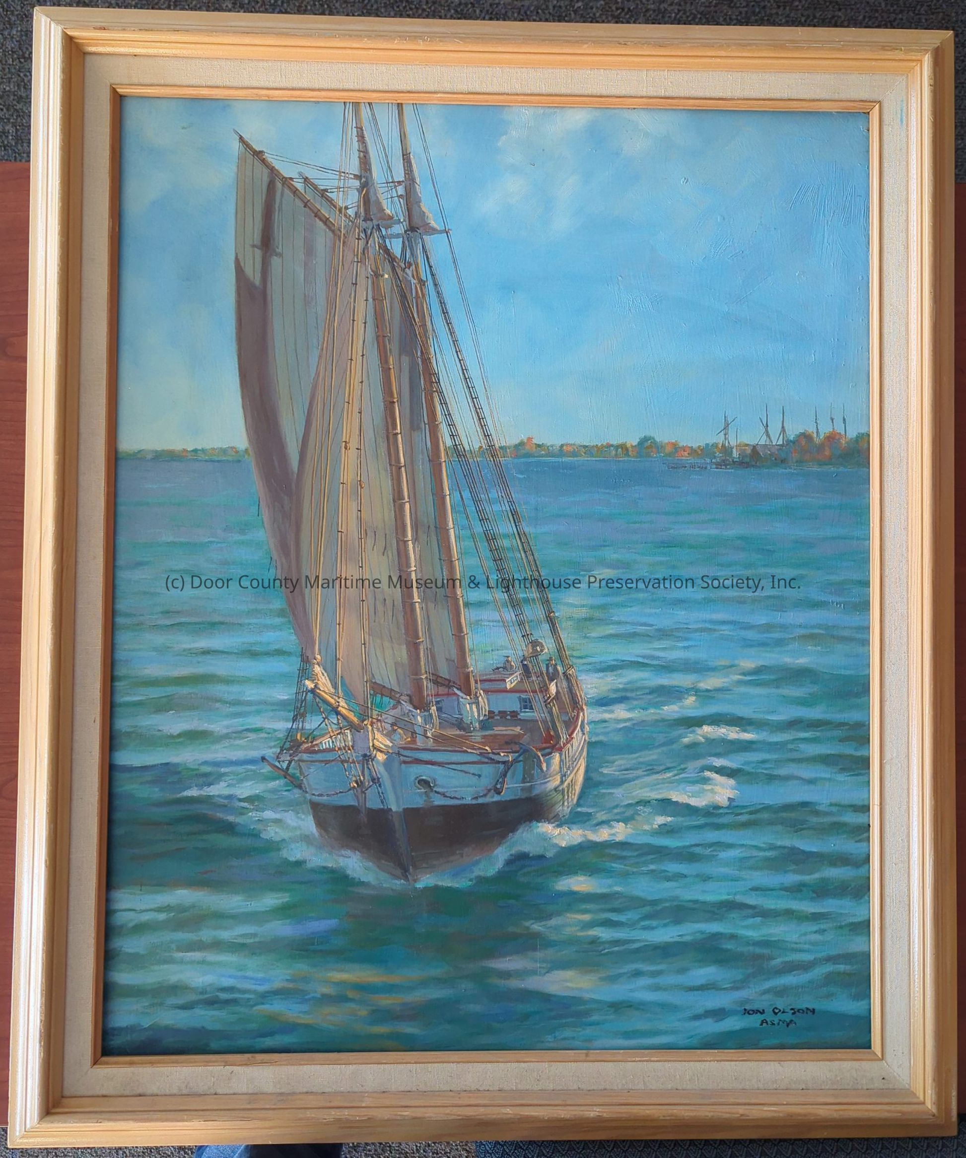 Oil Painting in gold and white frame. Depicts a schooner sailing away from land. Two schooners and buildings in backgroundLocation