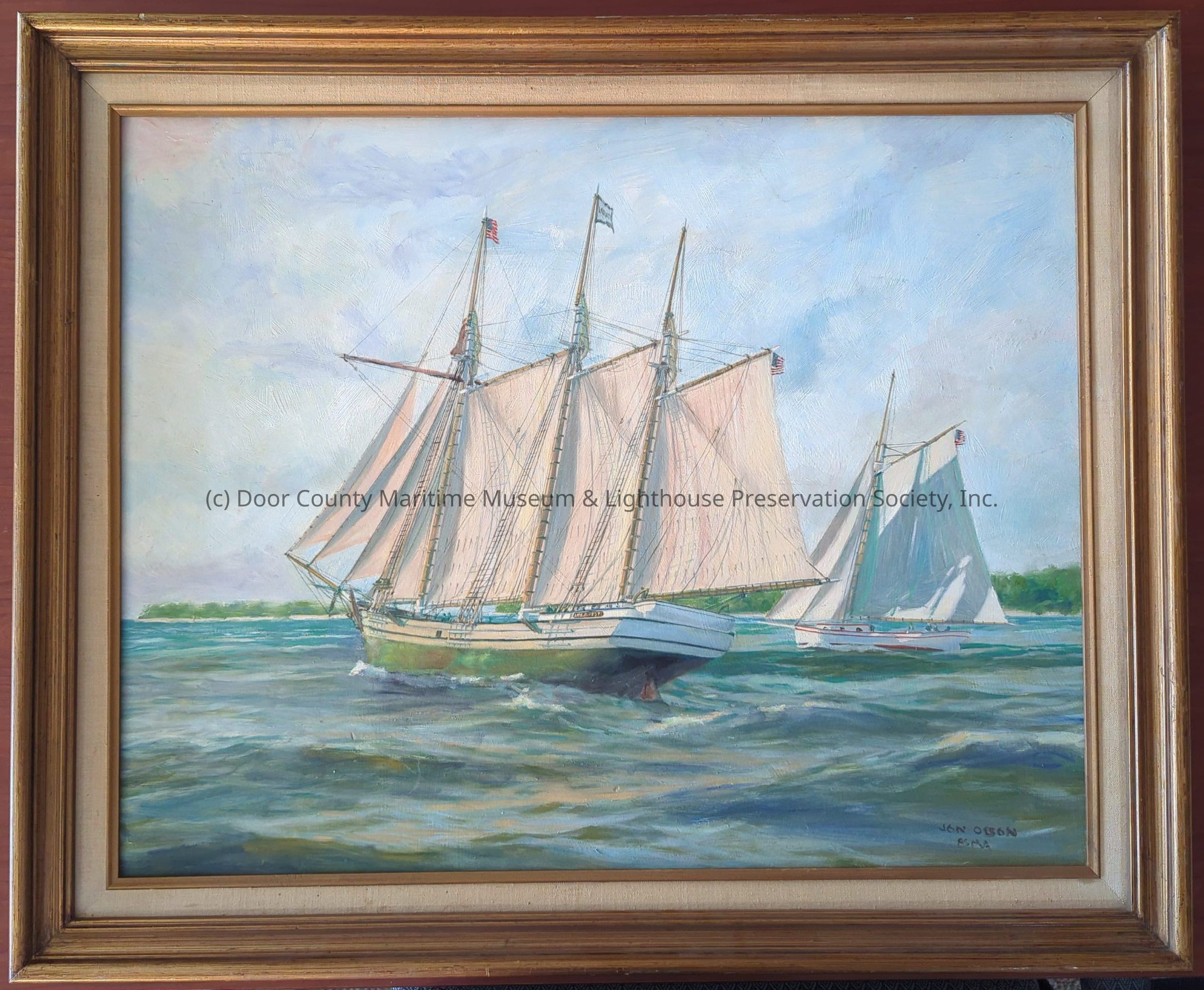 Oil Painting in golden wooden frame. Depicts a three masted schooner sailing along another vessel