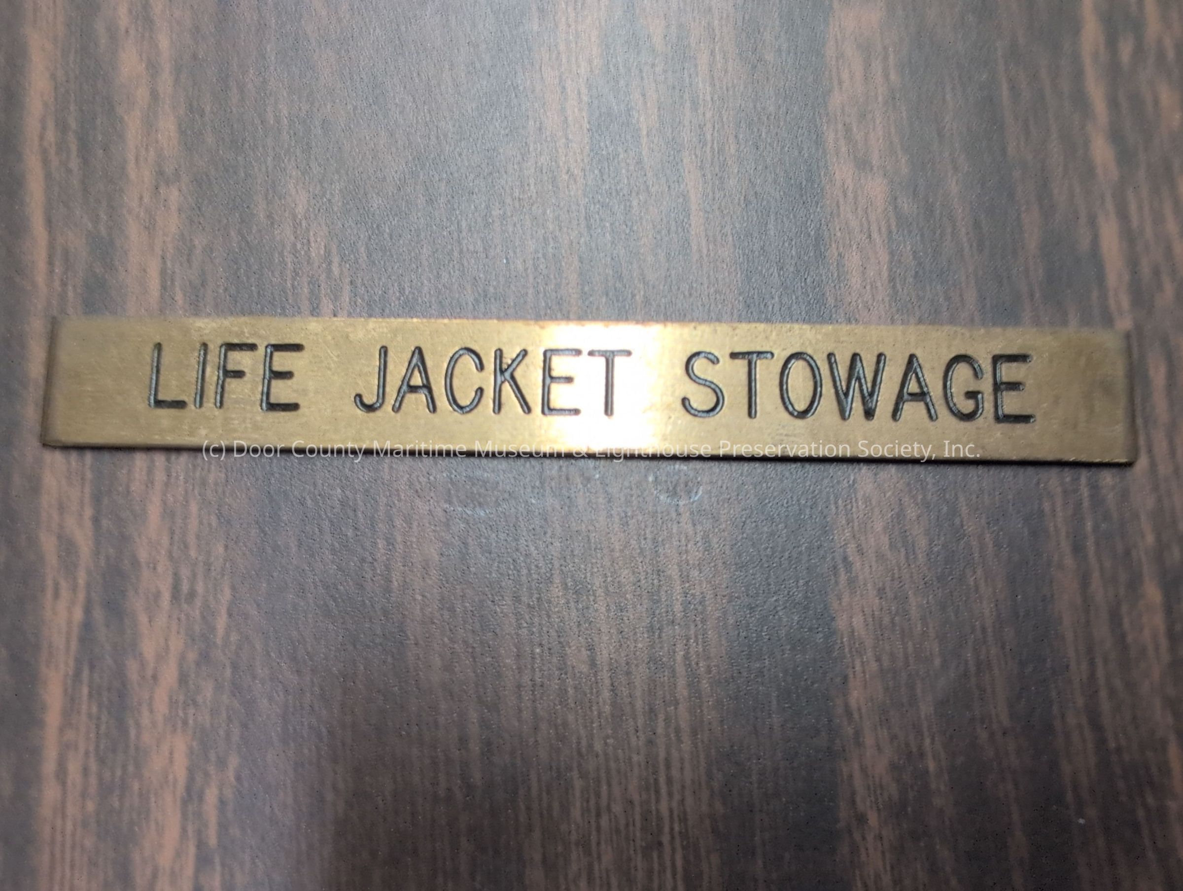 Brass nameplate stating "Life Jacket Stowage"