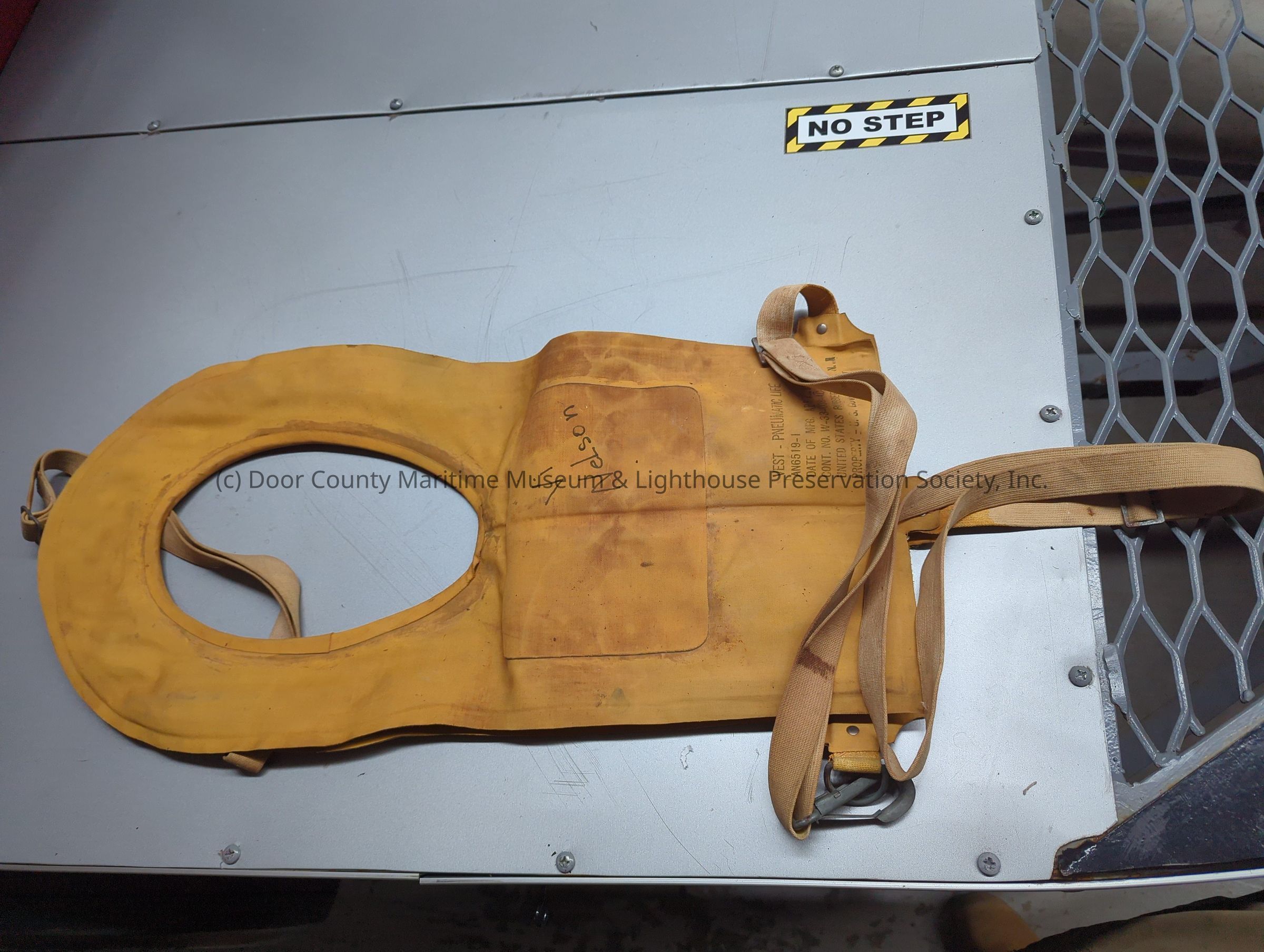 Gold colored life vest with black text stamped on front