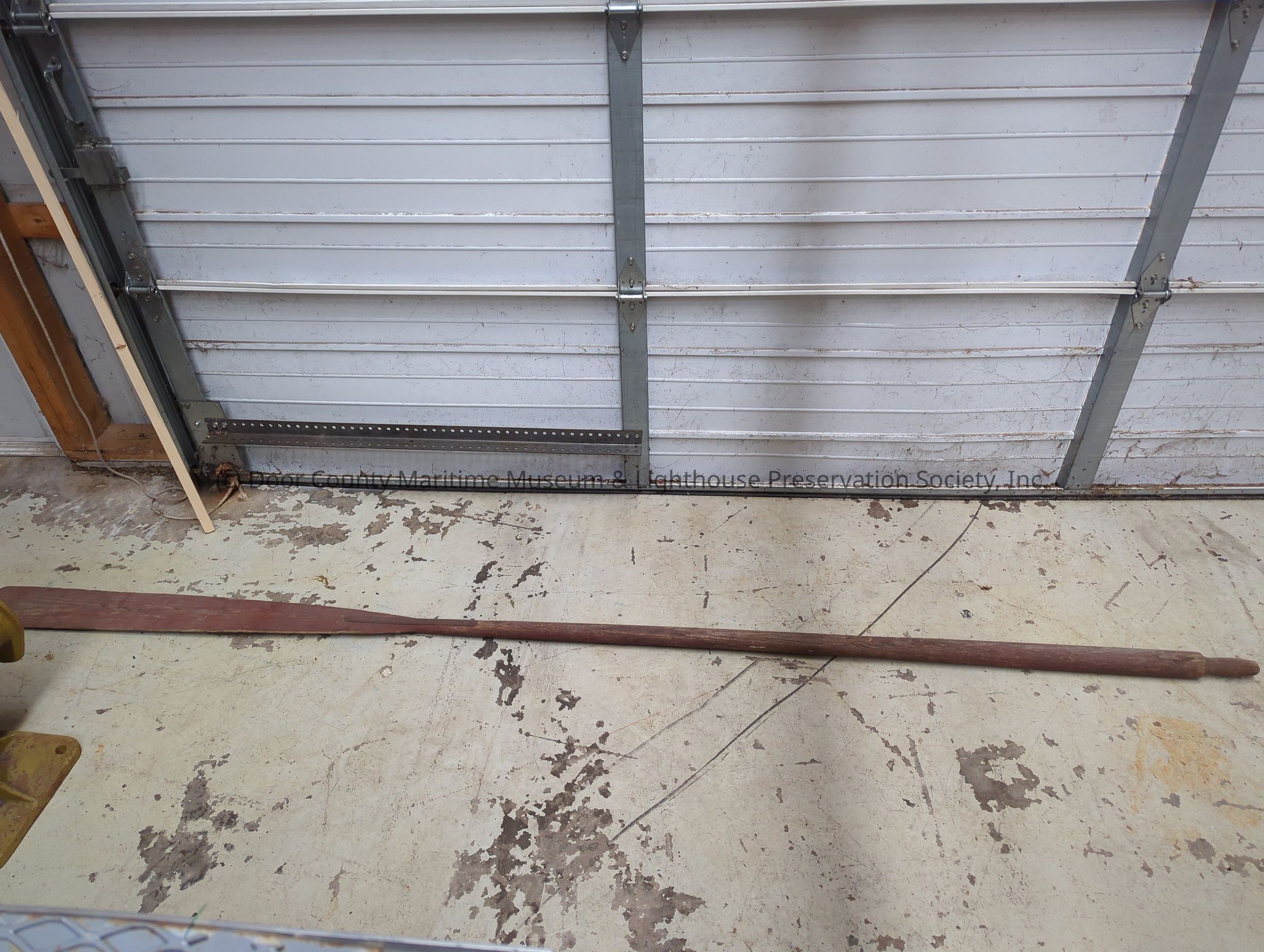 Dark red painted oar with most of the paint chipped off