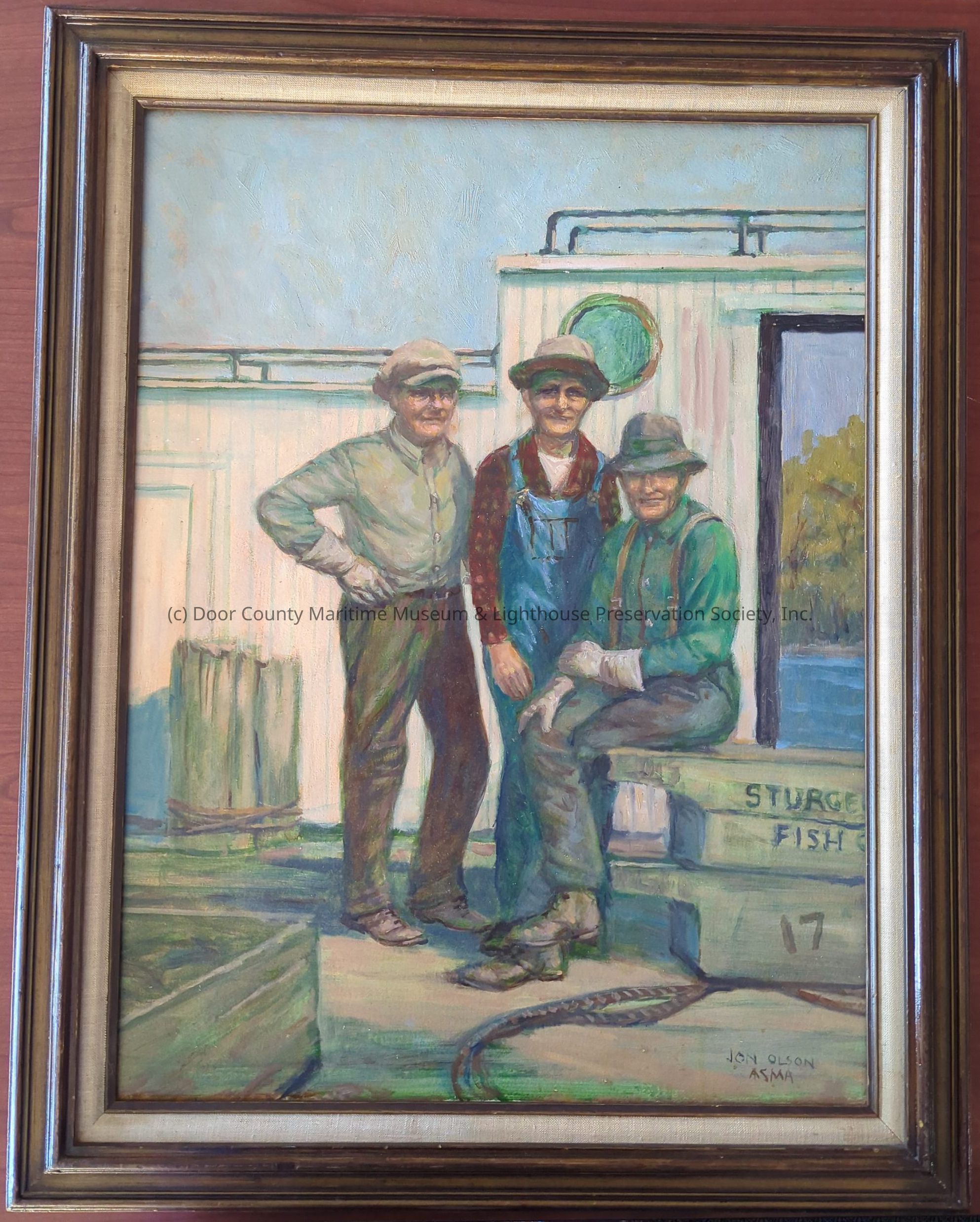 Oil painting on canvas in brown and white frame. Depicts three men posing on dock in front of a white fishing tugLocation