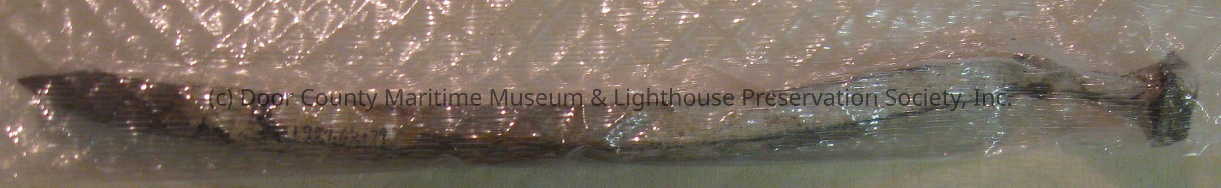 Rusted and bent metal with flat end on one side and a point on another