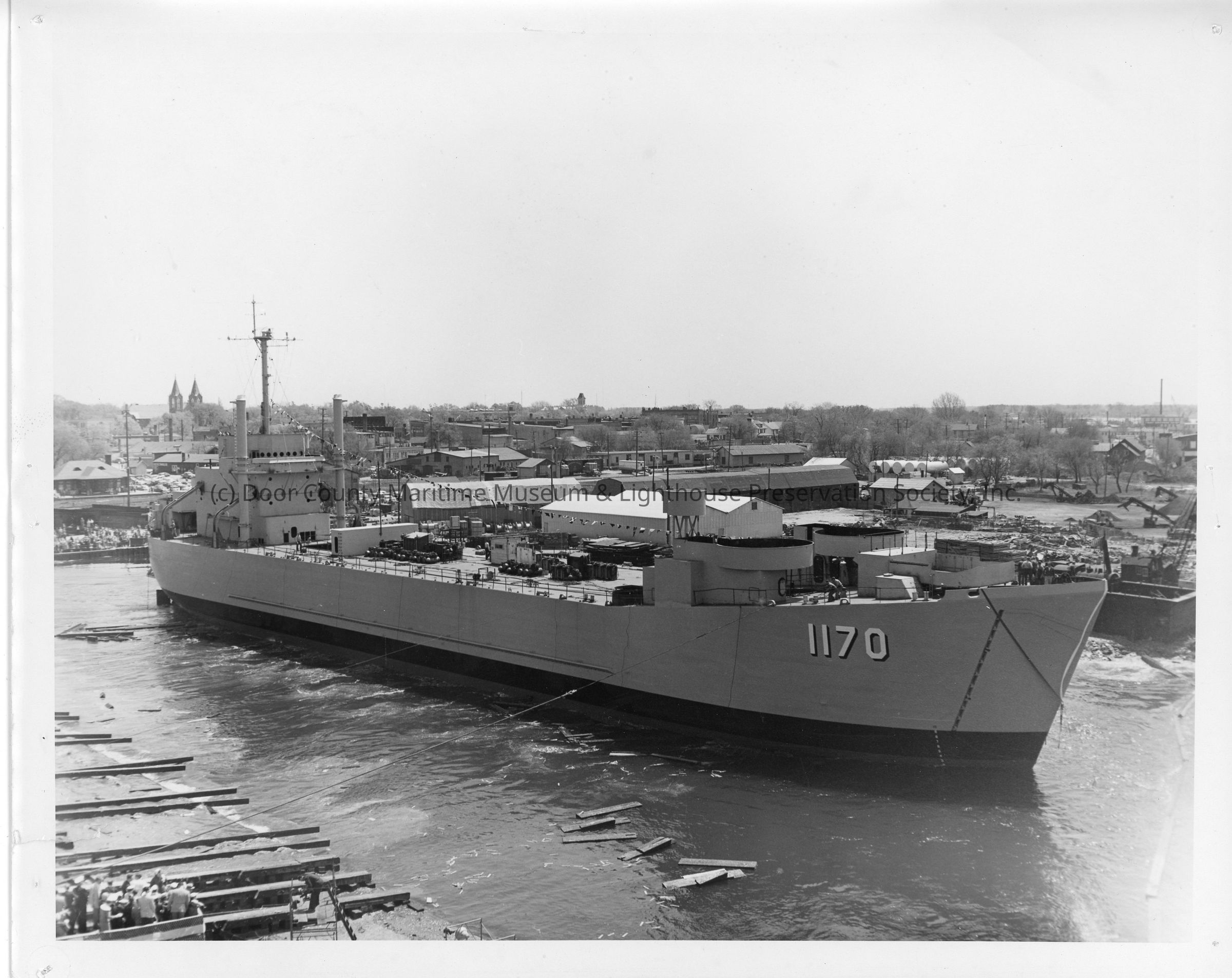 LST-1170 secured by cables Post-launch May 22, 1954Entry/Object ID