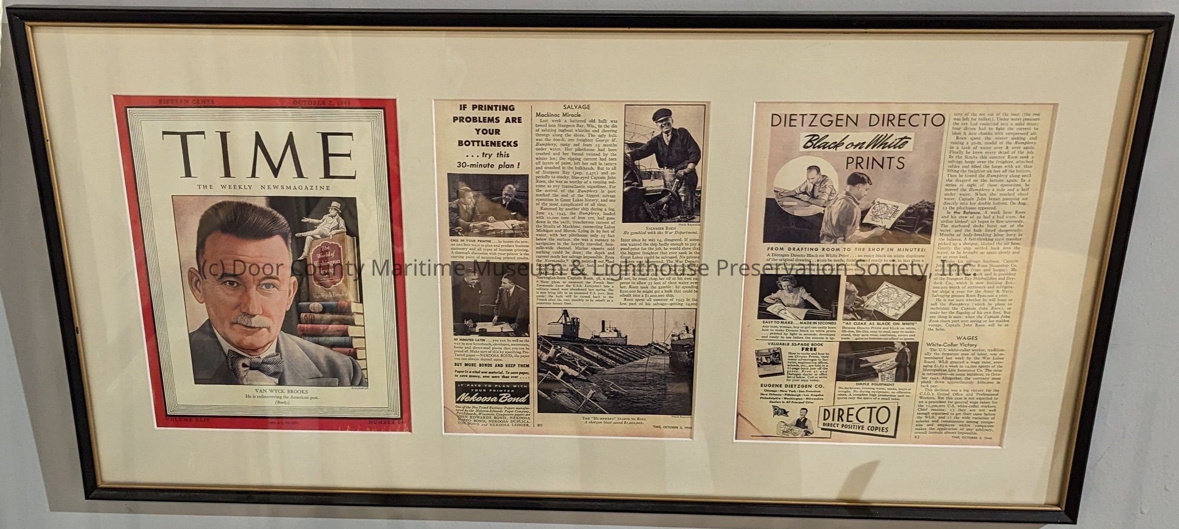 Black frame with gold trim; wire hanger; reprint of "Time" magazine cover vol. XLIV, Number 14 and two page article and photographs of Capt. John Roen and "Humphrey" being raised; cream colored mat; incidental adsLocation