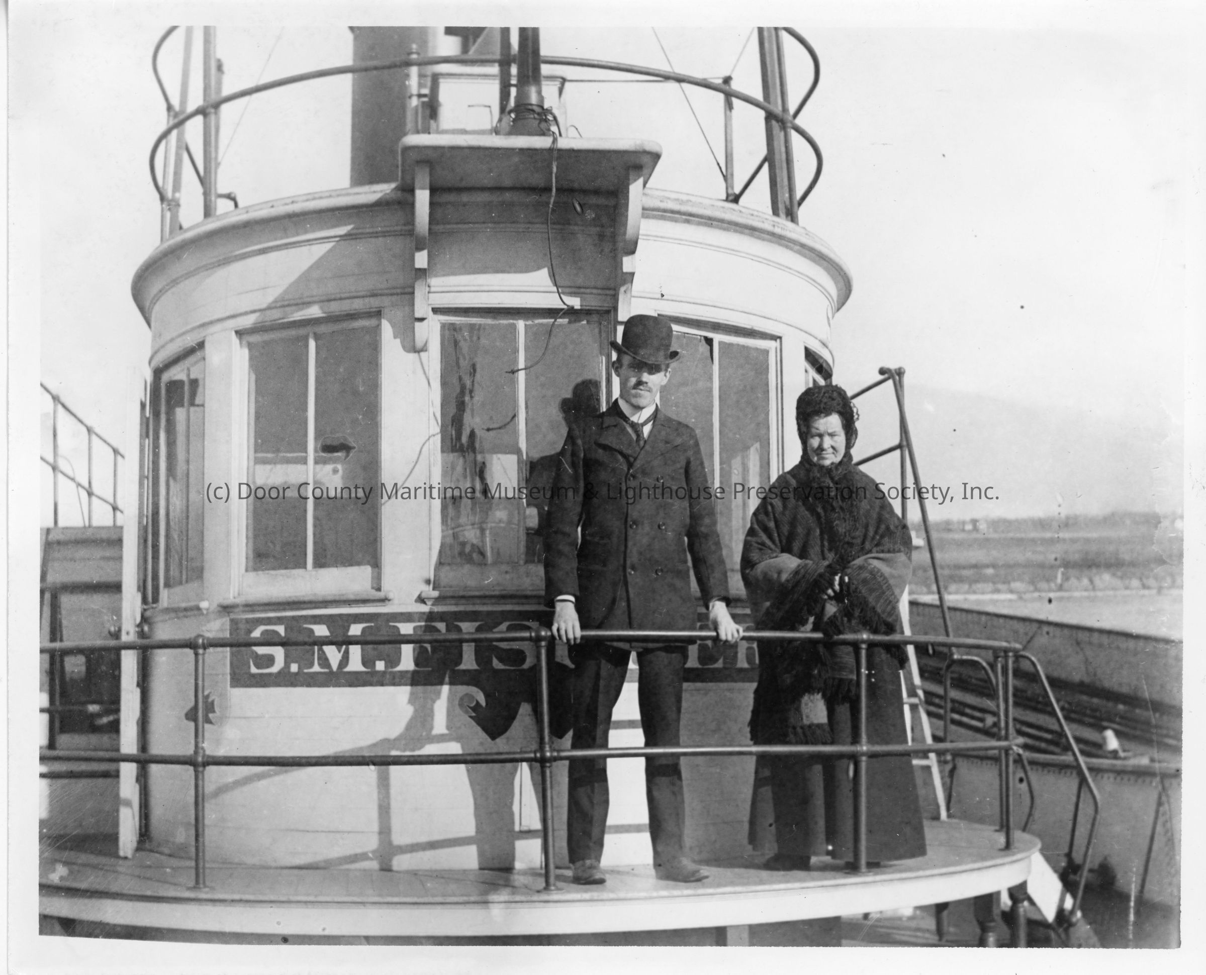 Man and woman on deck of pilothouse of vessel
