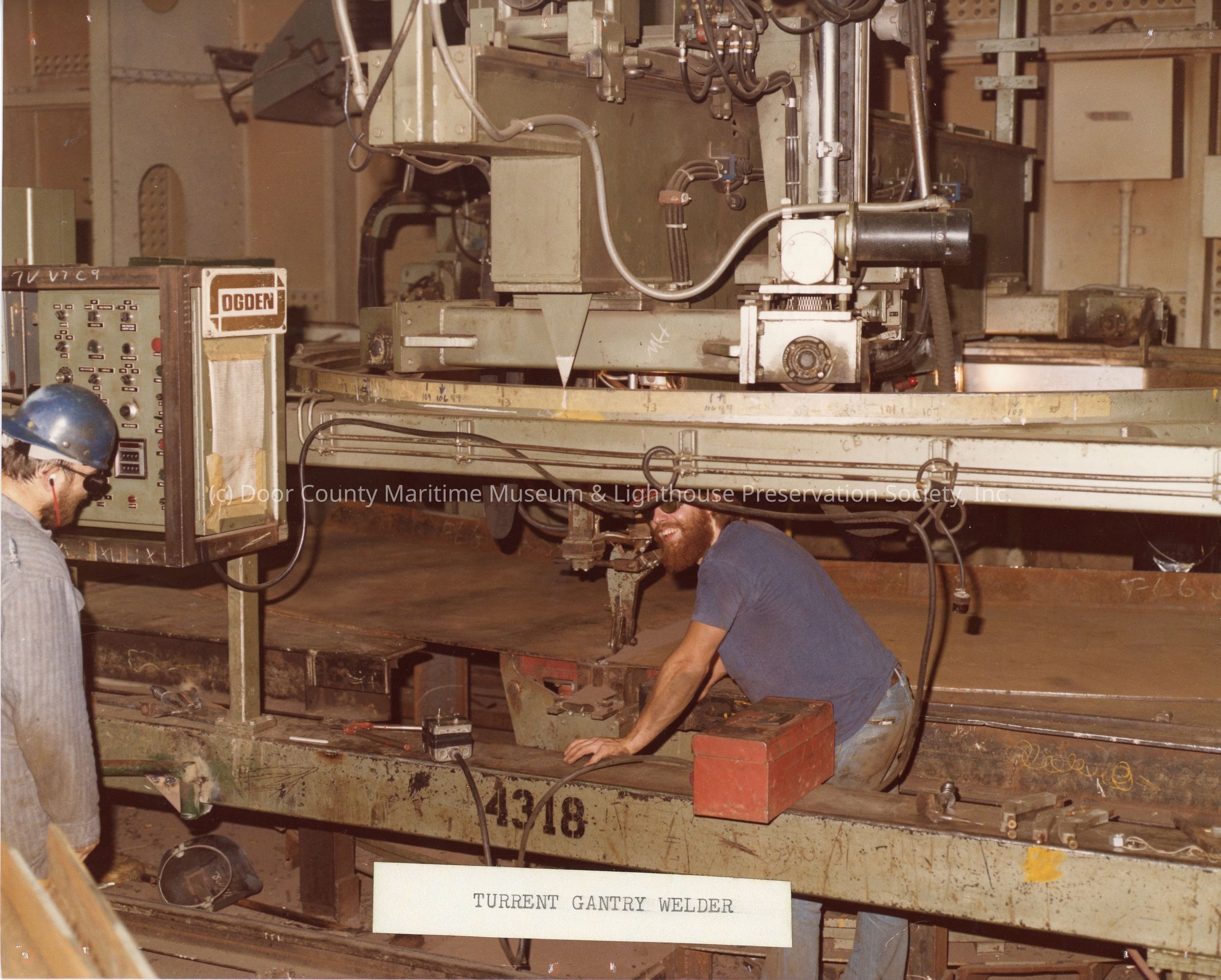 Man at controls, man at welding site of turrent gantry welderEntry/Object ID