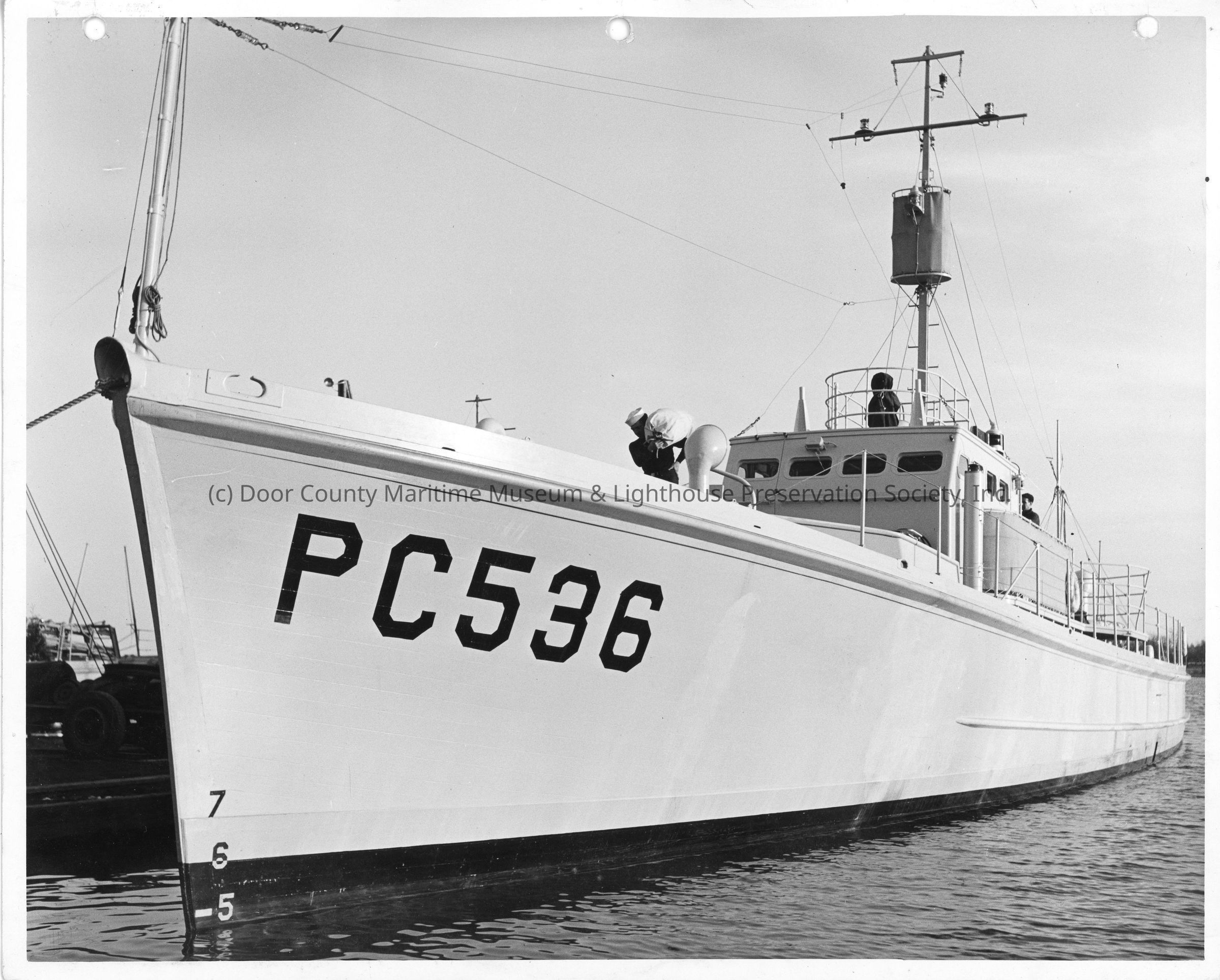 Man carrying sack on deck of PC-536 while docked at Peterson Boat Works June 30, 1942