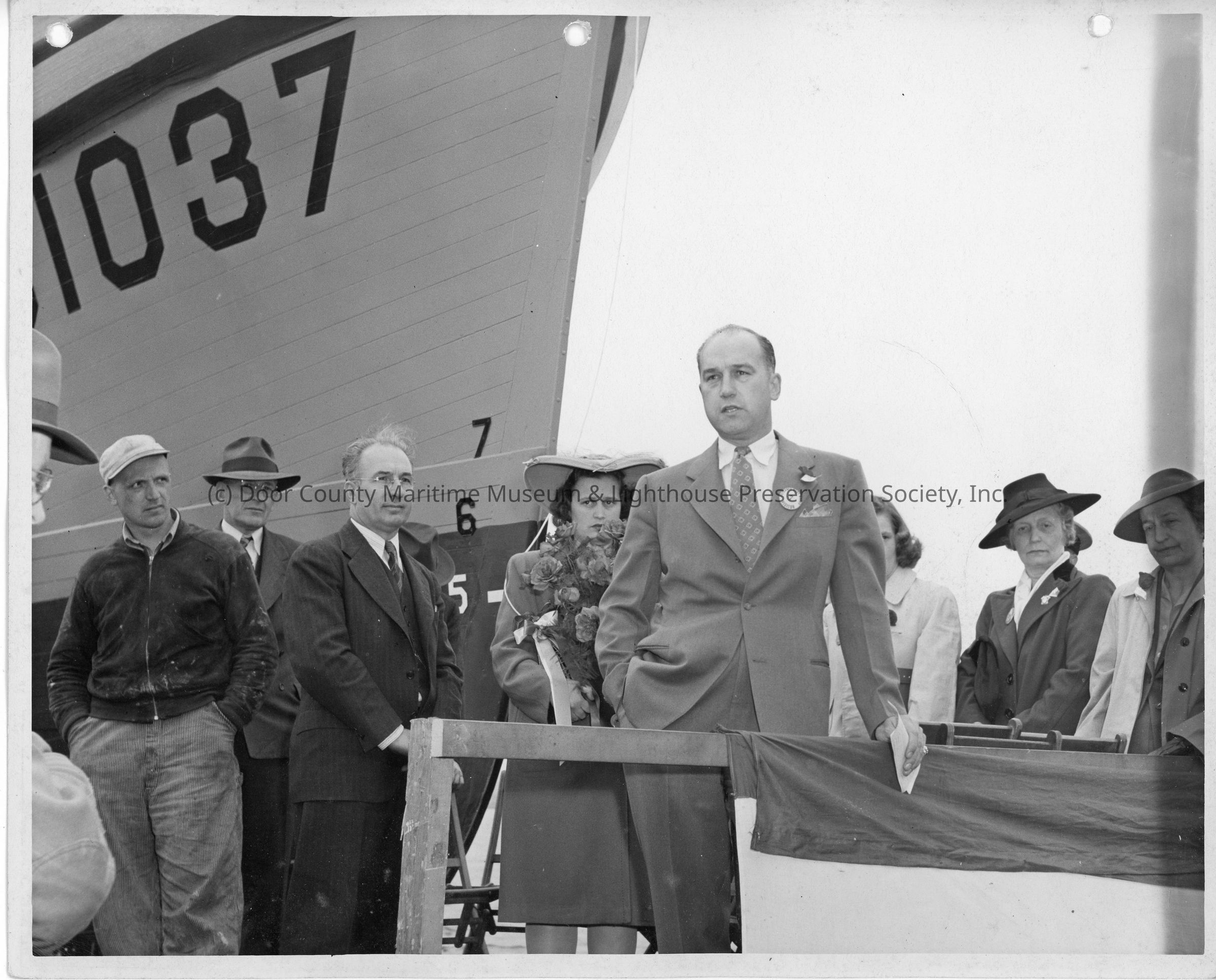 Man giving speech at christening of SC-1037 with ship sponsor and Fred Peterson in background May 29, 1943Entry/Object ID