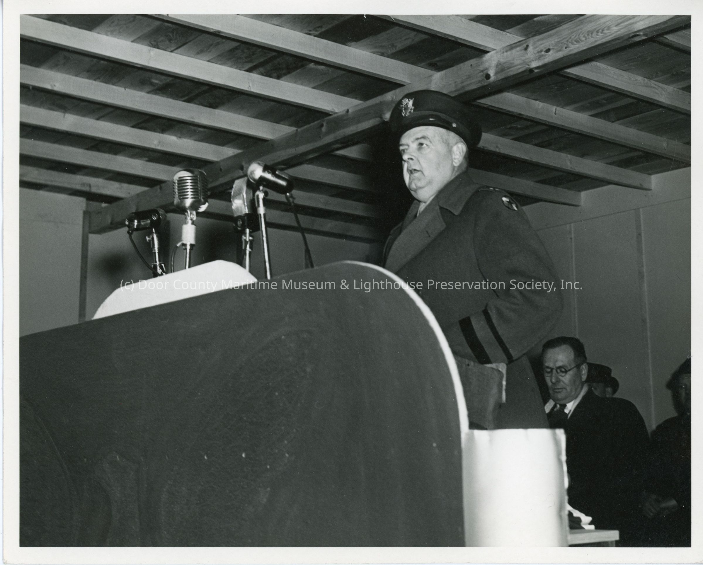 Man giving talk at Army Navy E award ceremony at Sturgeon Bay Shipbuilding and Drydock Company April 20, 1944Entry/Object ID