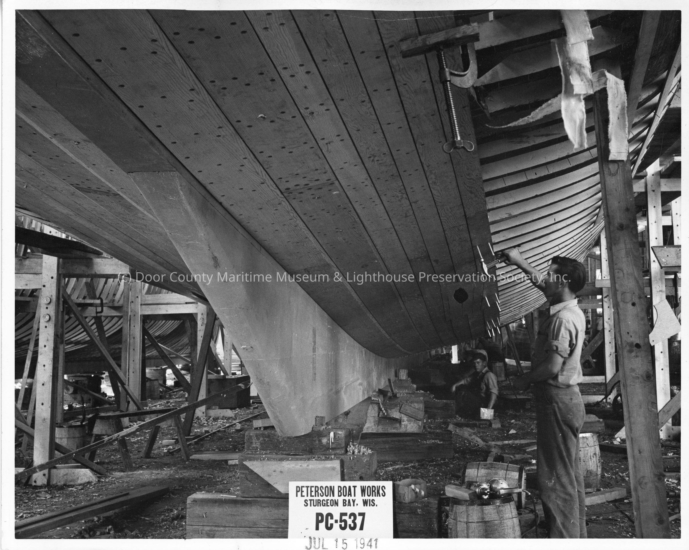 Man hammering nails into hull of PC-537 at Peterson Boat Works July 15, 1941