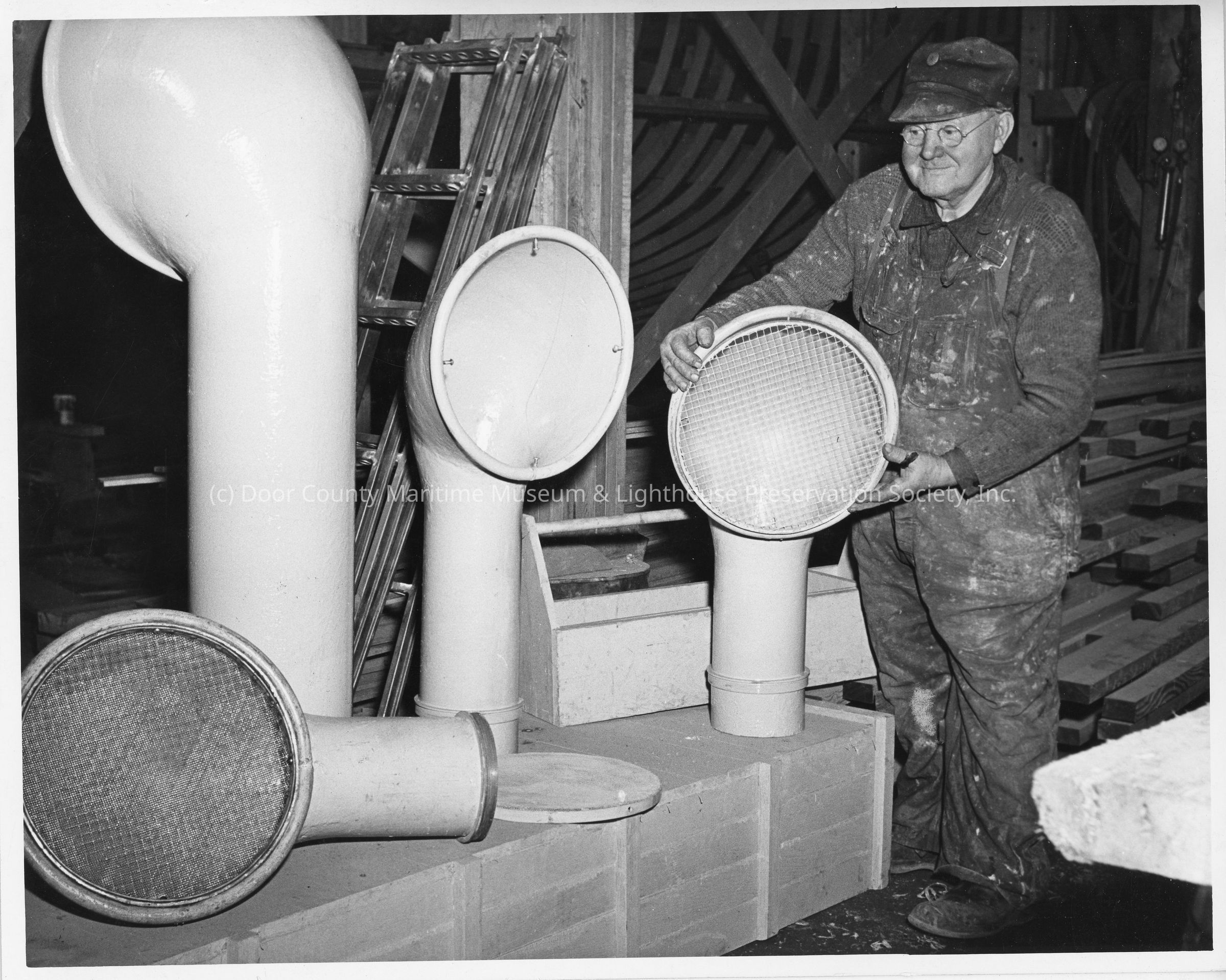 Man holding air funnel at Peterson Boat Works February 11, 1942