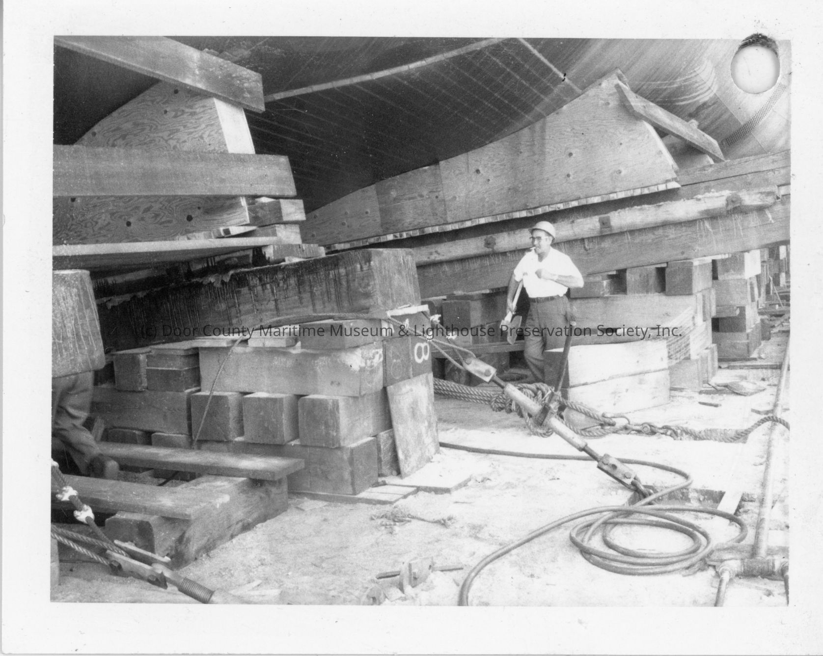 Man holding axe walkding by skids supporting the Margaret L at PBI August 19, 1972Entry/Object ID