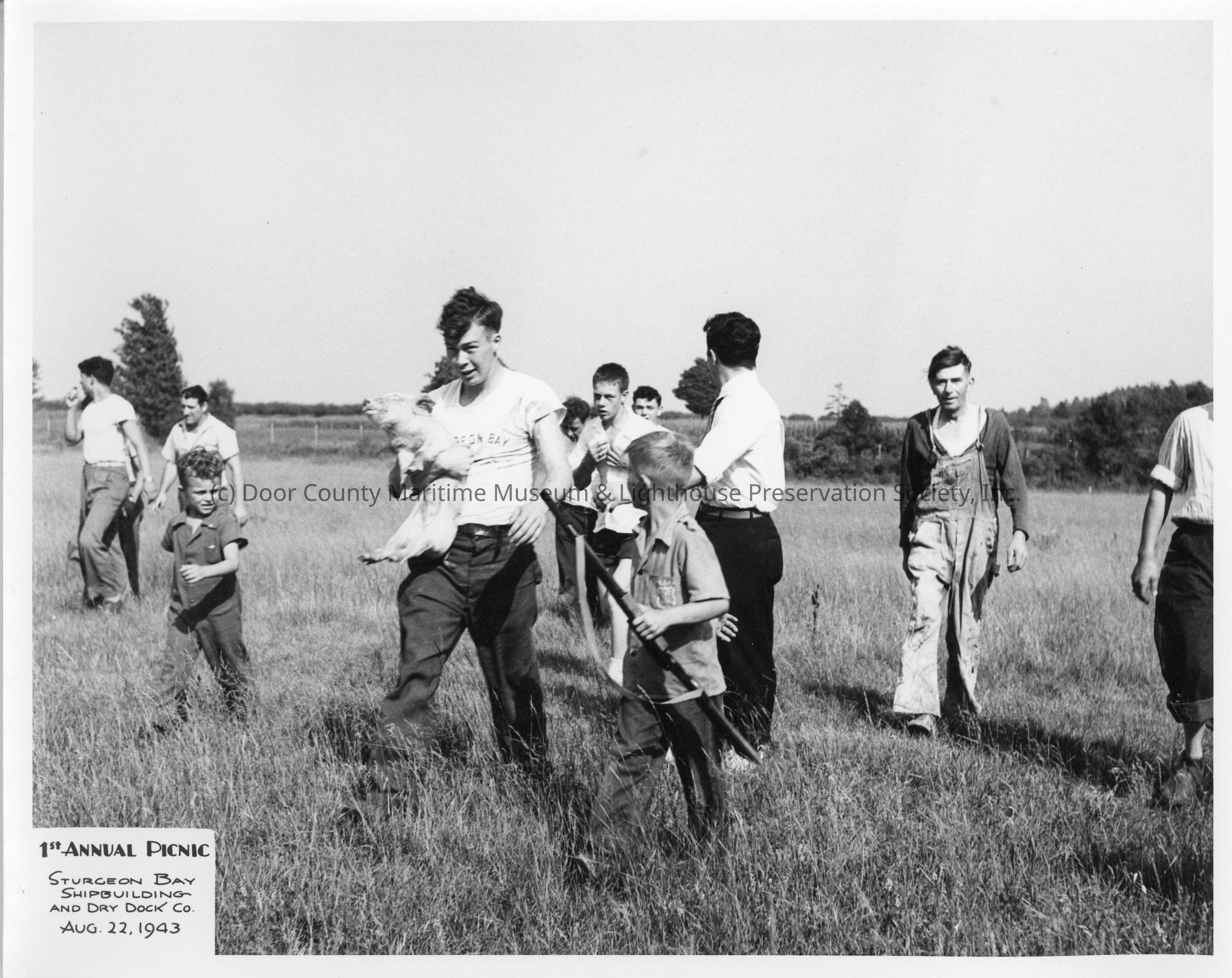 Man holding pig next to kid with gun at SBSB&DD Co. 1st annual picnic August 22, 1943Entry/Object ID
