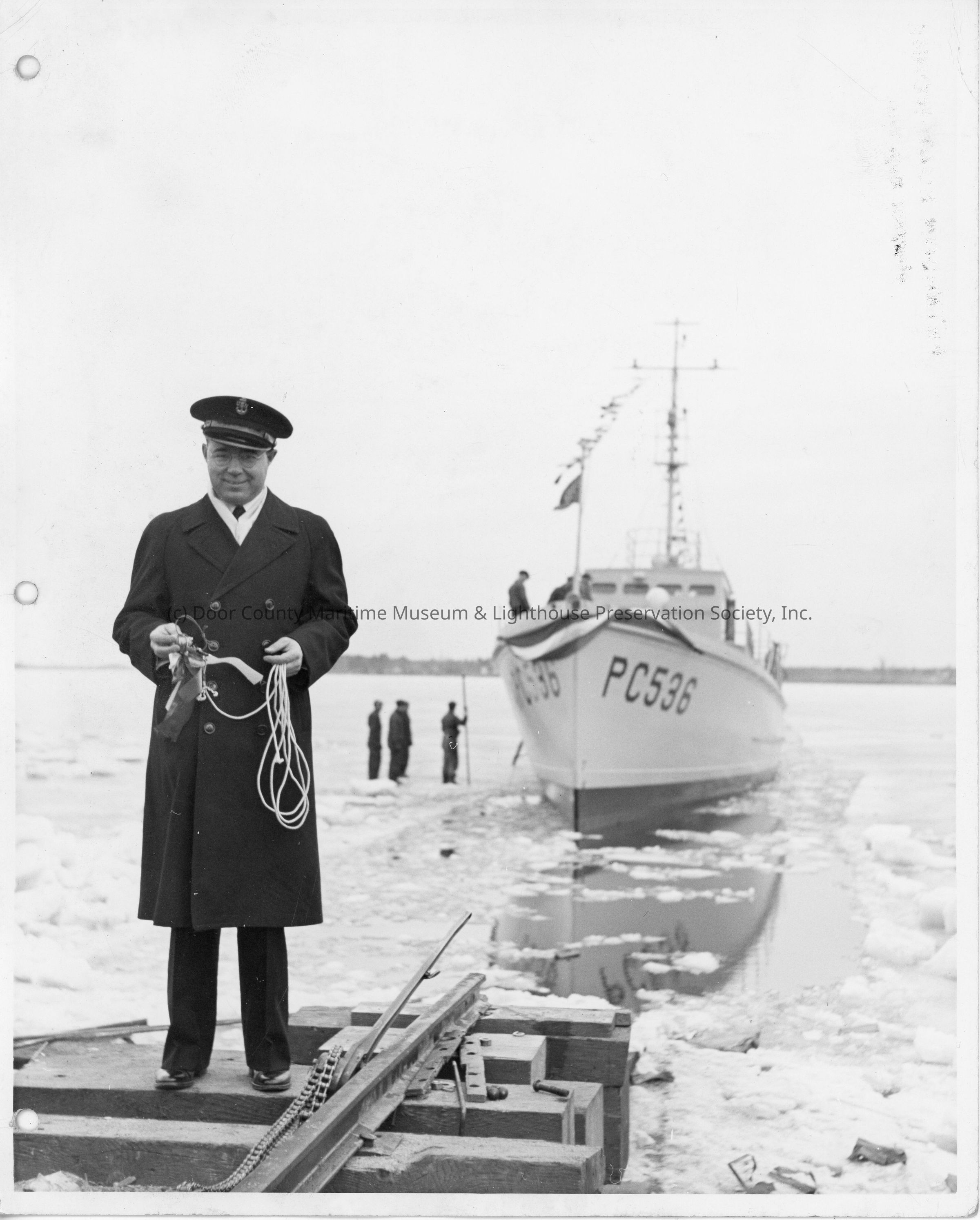 Man holding remains of christening bottle with PC-536 in water post-launch at Peterson Boat Works March 5, 1942Entry/Object ID