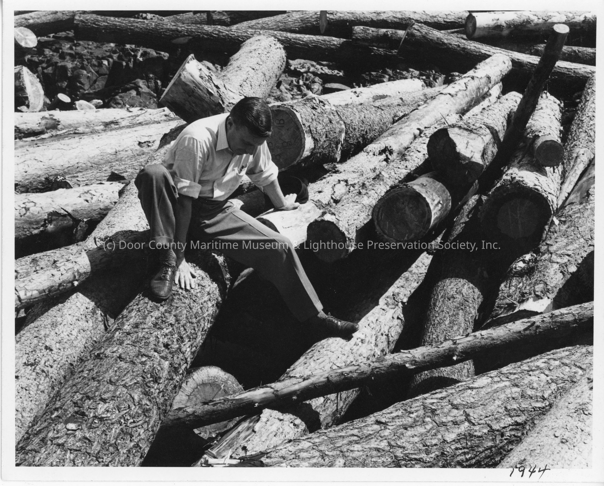 Man in dress clothes sitting on a pile of logs 1944