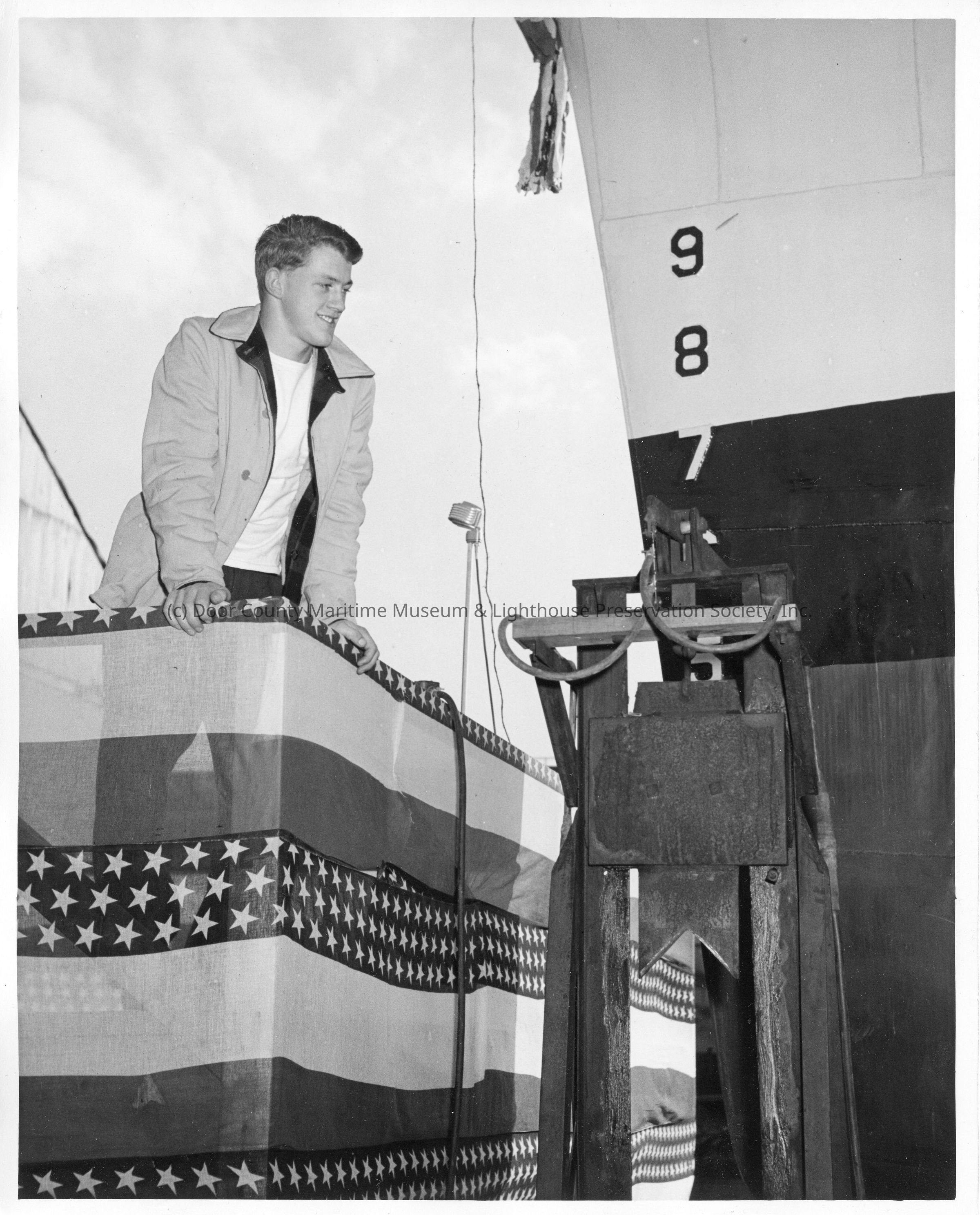 Man in speaker's box next to ship