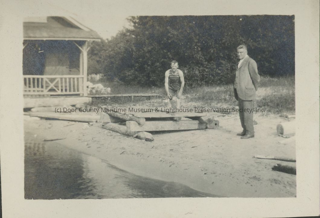 man in swimsuit building pier