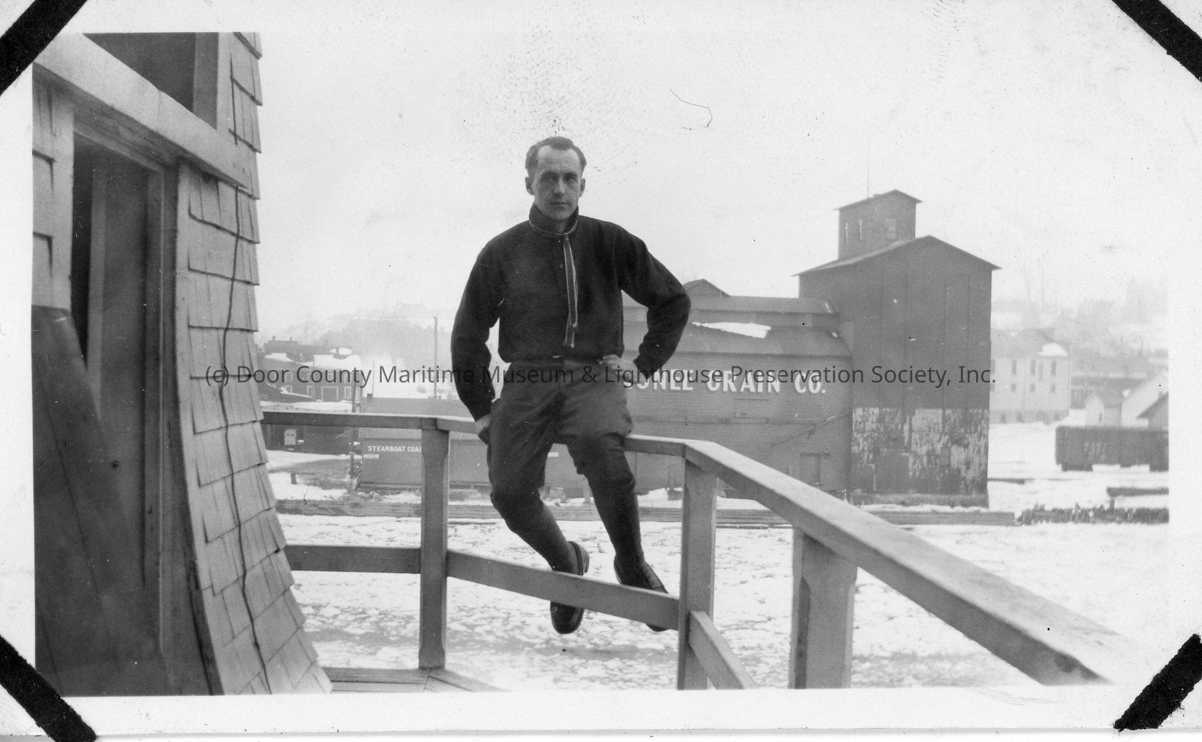 Man sitting on railing wither grain elevator in background during winter