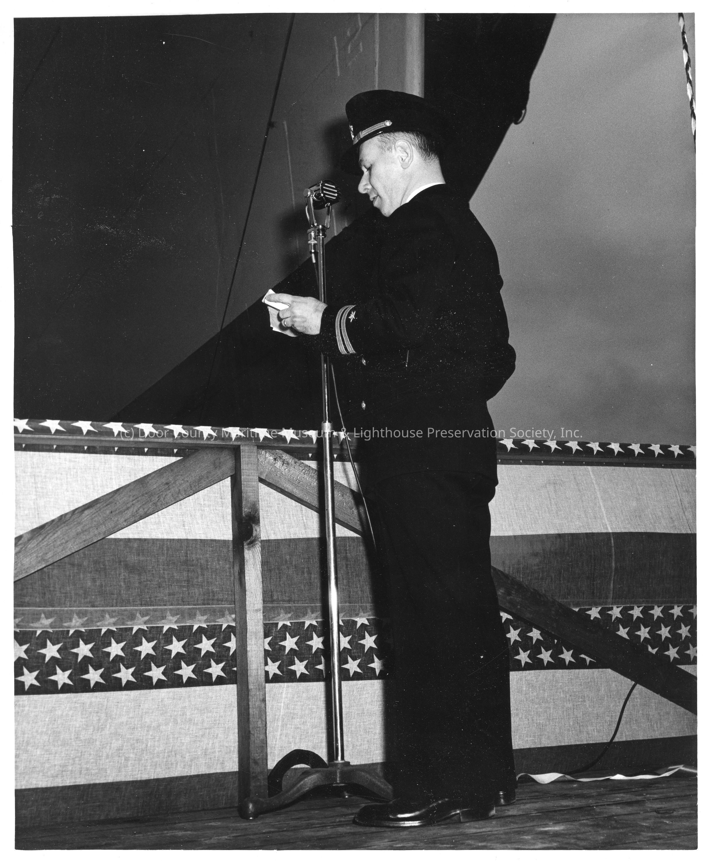 Man speaking at microphone during christening