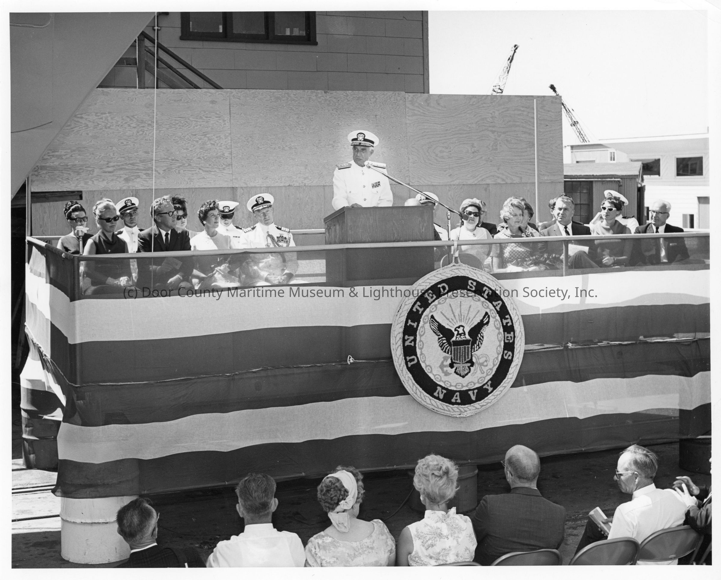 Man speaking at podium during the christening of PG-95 USS Defiance