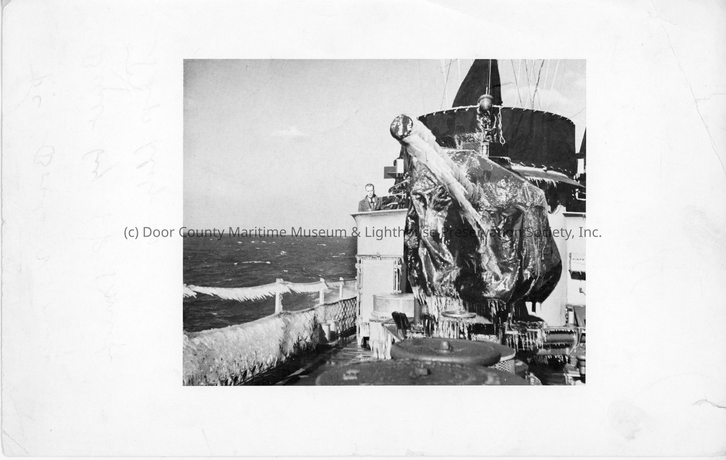 Man standing by deck gun of Leathem D. Smith Shipbuilding Co. subchaser