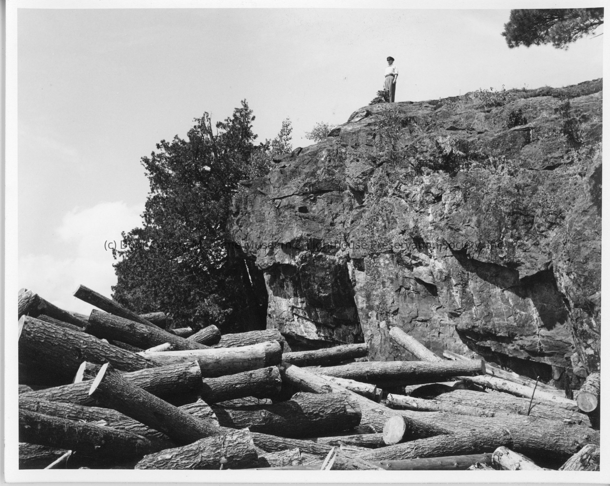 Man standing on cliff above a pile of logs