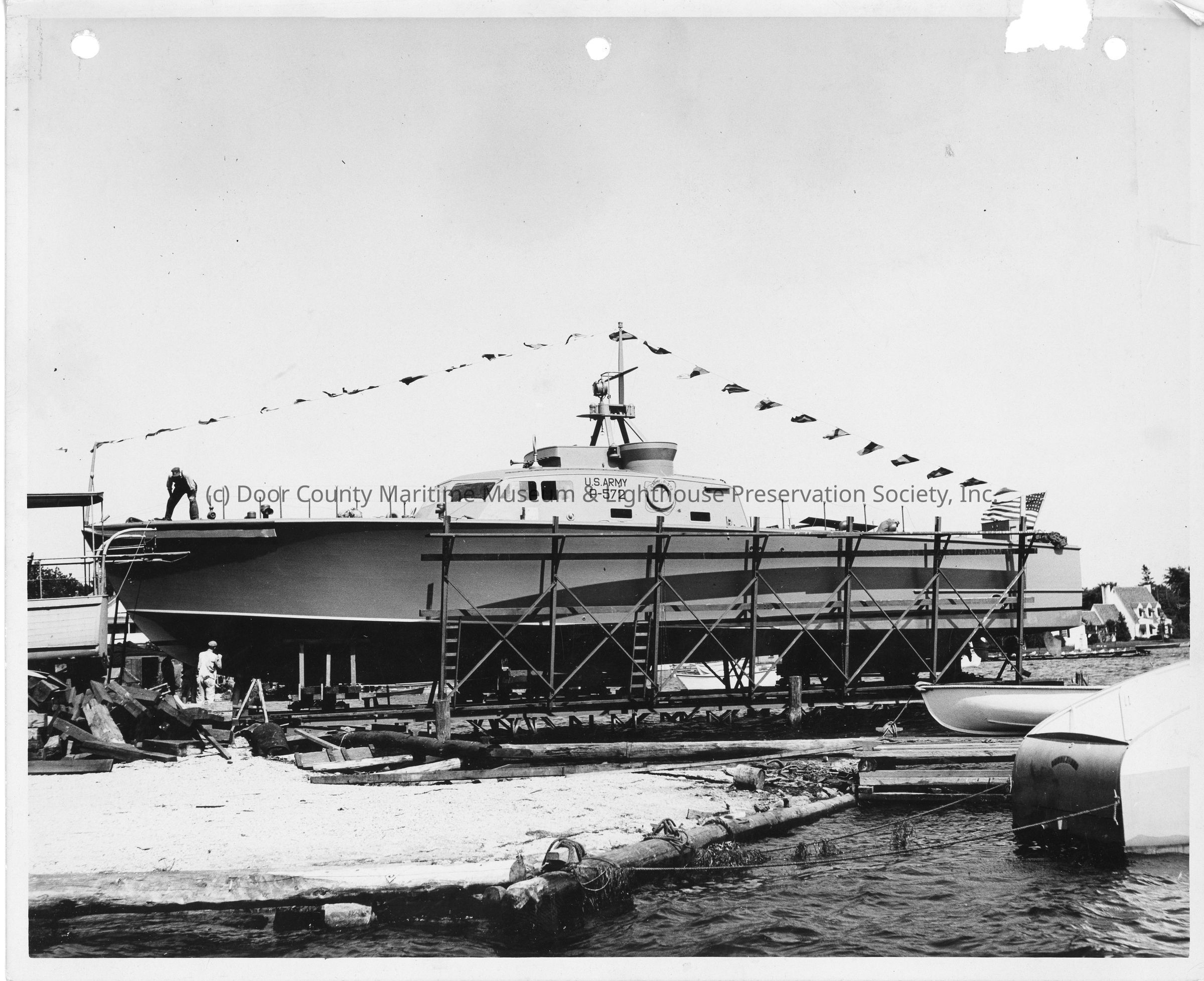 Man standing on deck of P-572 in cradle at Peterson Boat Works August 8, 1944