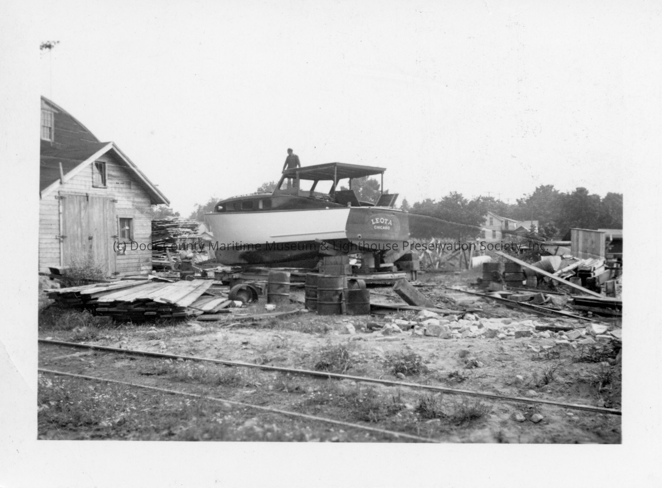 Man standing on Leota pre-launch at Peterson Boat Works 1935