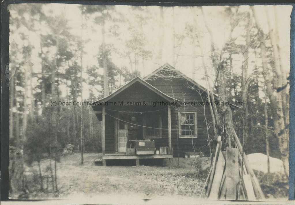 Man stands on porch of a cottage in the woods. Identified as Kincaid's.