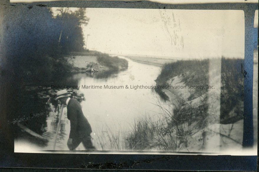 A man walking along the shoreline of a creek at Shivering Sands. August 1923