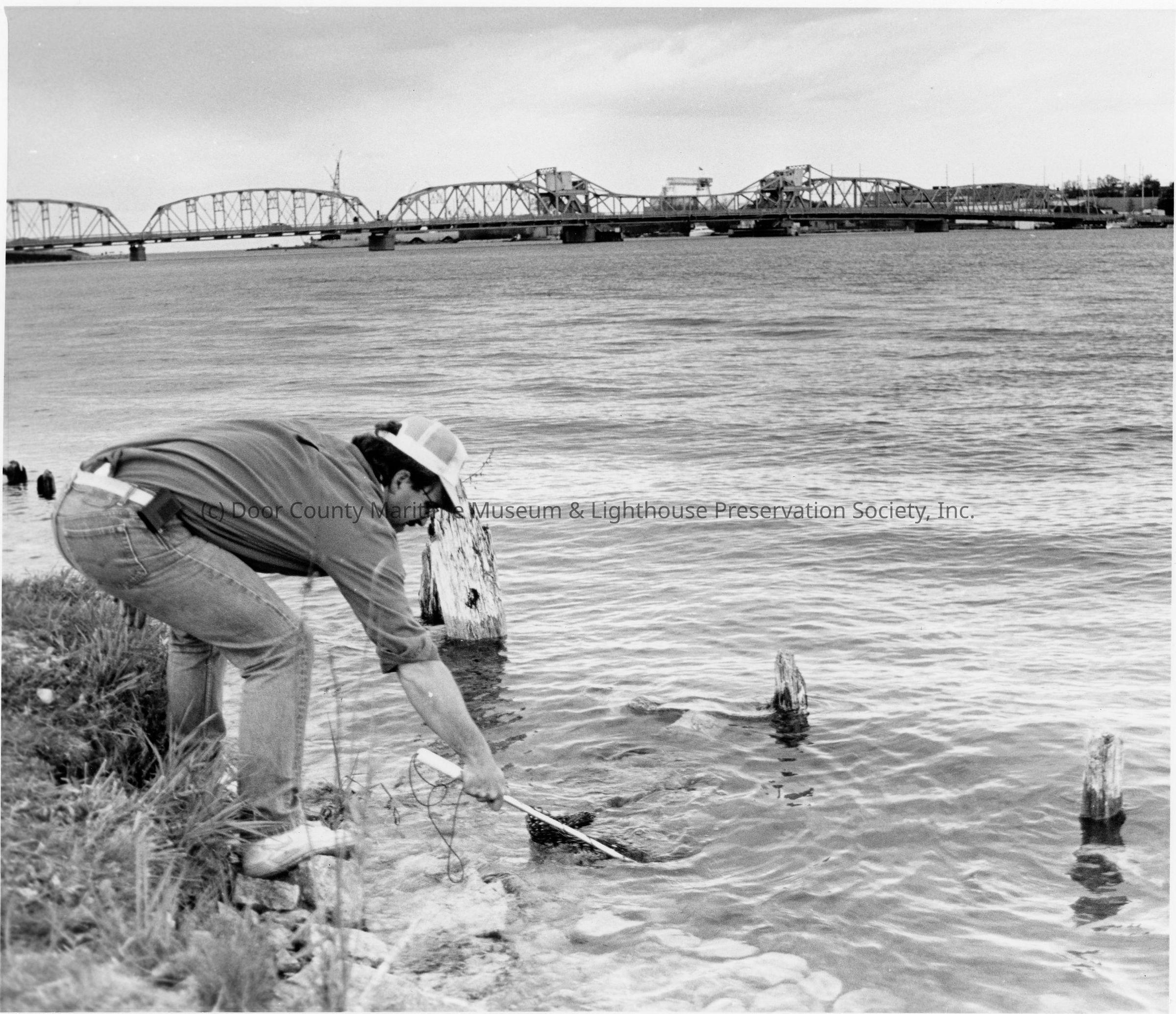 man with beeper bending over netting something with Michigan Street bridge 1993Entry/Object ID