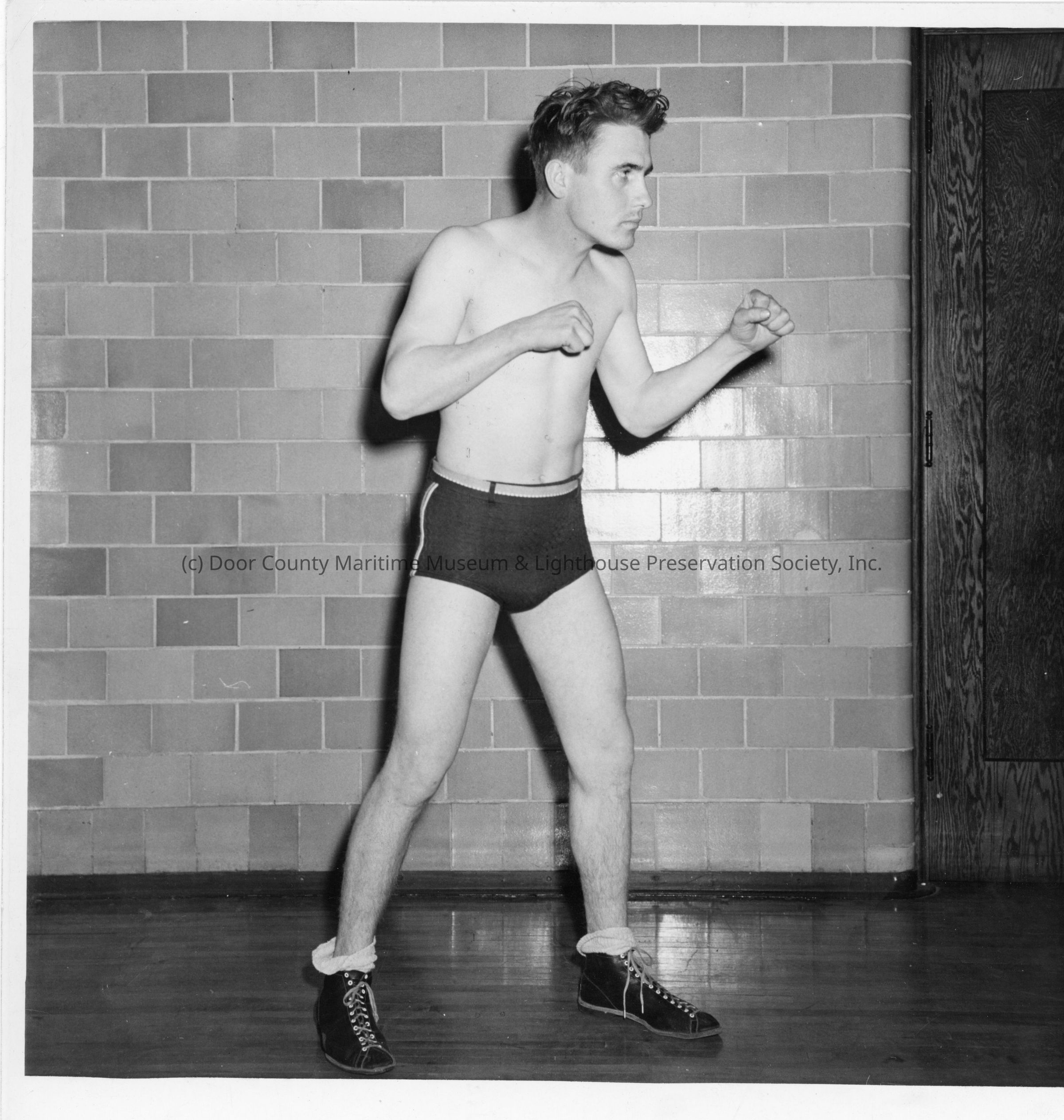 Man with shirt off in boxing stance