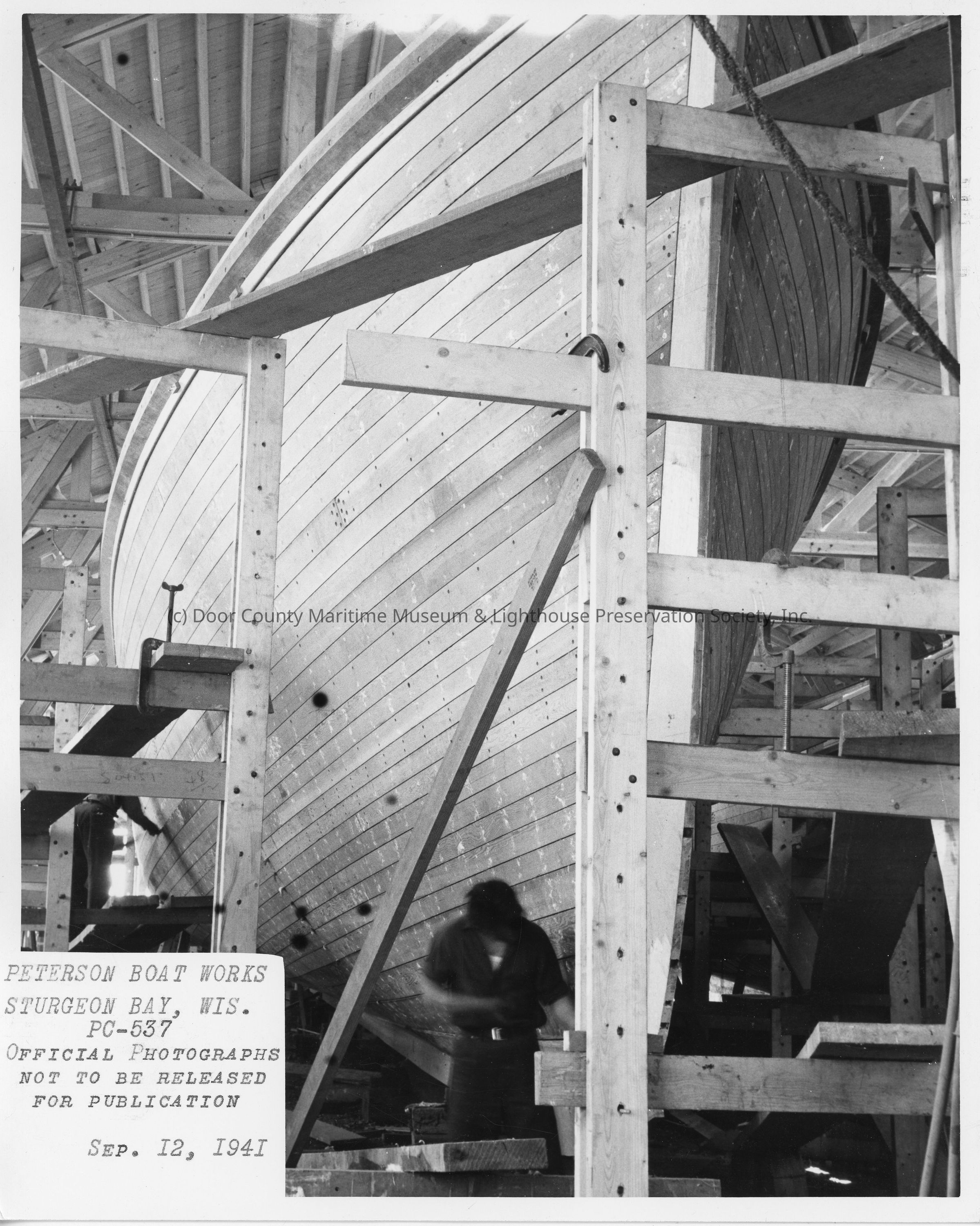 Man workingon hull of PC-537 at Peterson Boat Works September 12, 1941