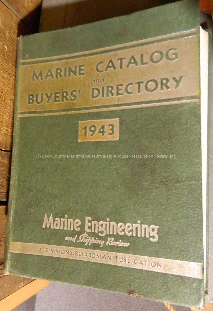 Reference book: hard cover; green with silver "Marine Catalog & Buyers' Directory" 1943; first edition; Marine engineering and shipping review; Editor, L.S. Blodgett; outer and inner cover very dirty; edges of pages dirty; pages pulling away from binding.Location
