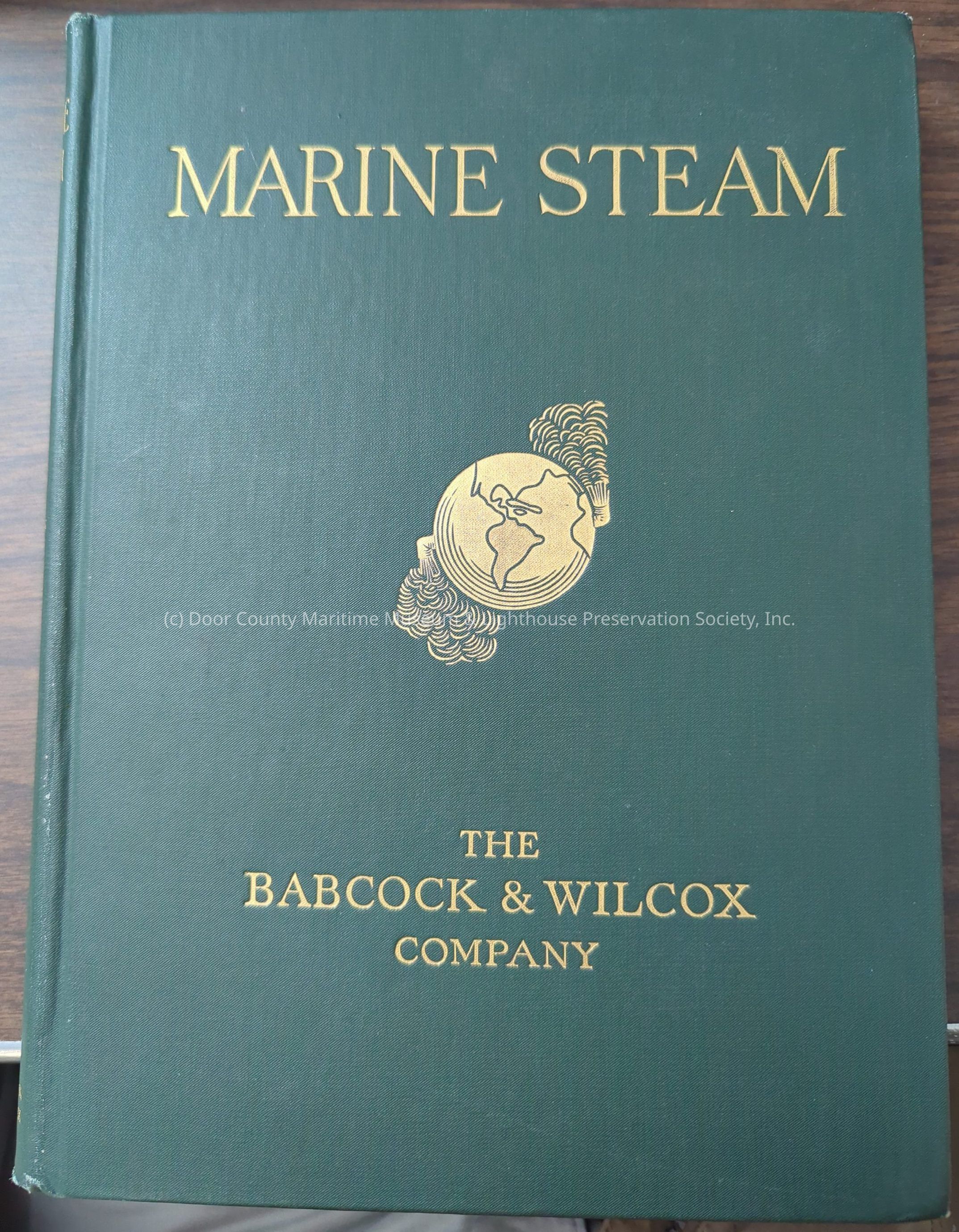 Green hard cover book with picture of globe and two exhaust pipes on side. "Marine steam The Babcock & Wilcox Company"Location
