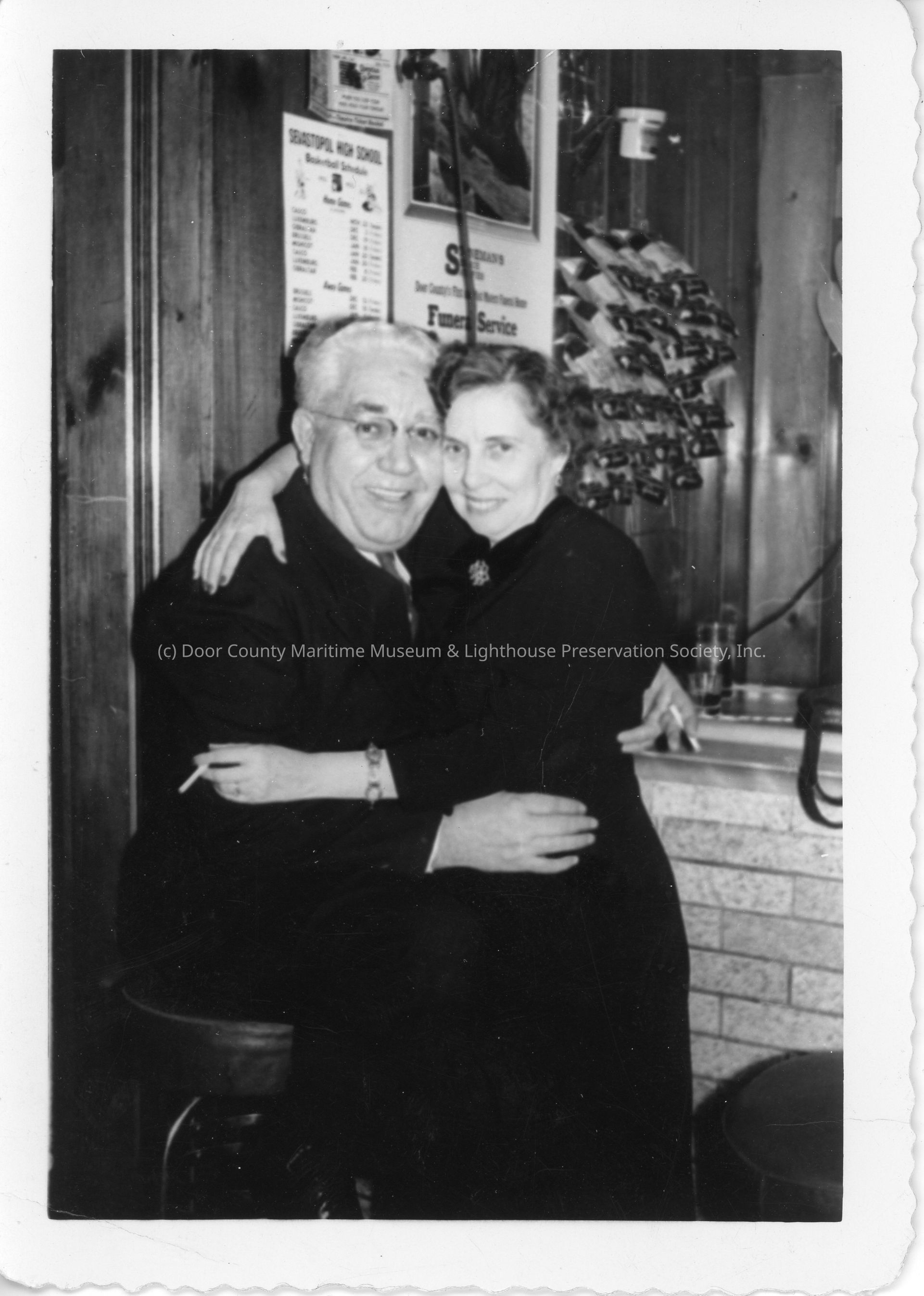 Colorless photograph of Navy Office Party. Marion and Leo La Mere hugging. Both have cigarettesLocation